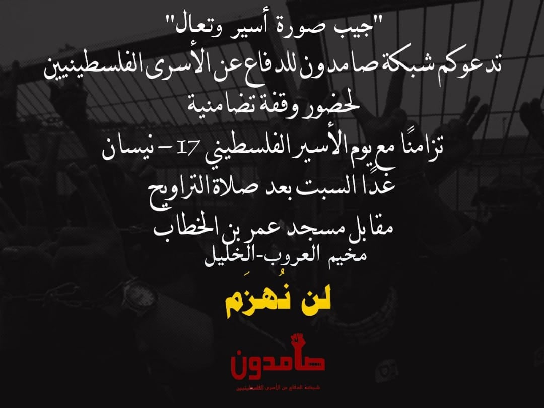 تدعوكم شبكة صامدون- فلسطين المحتلة، إلى الحشد والمشاركة في الوقفة التضامنية في مخيم العروب مع الأسيرات والأسرى في السجون الصهيونية، وتزامناً مع يوم الأسير الفلسطيني 17 نيسان.