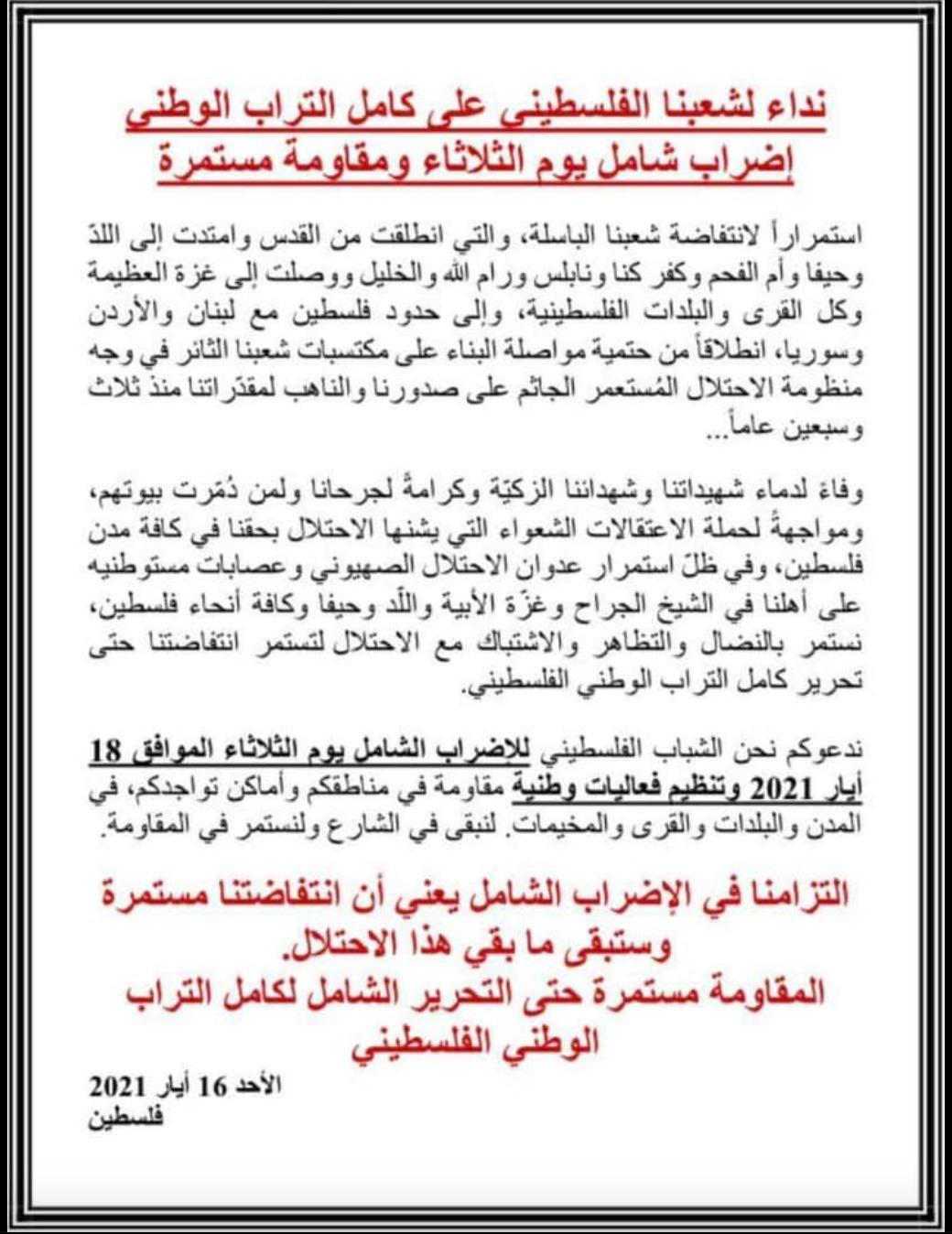 ندعوكم نحن الشباب الفلسطيني للإضراب الشامل يوم الثلاثاء الموافق 18 أيار 2021 وتنظيم فعاليات وطنية مقاومة في مناطقكم وأماكن تواجدكم، في المدن والبلدات والقرى والمخيمات. لنبقى في الشارع ولنستمر في المقاومة.