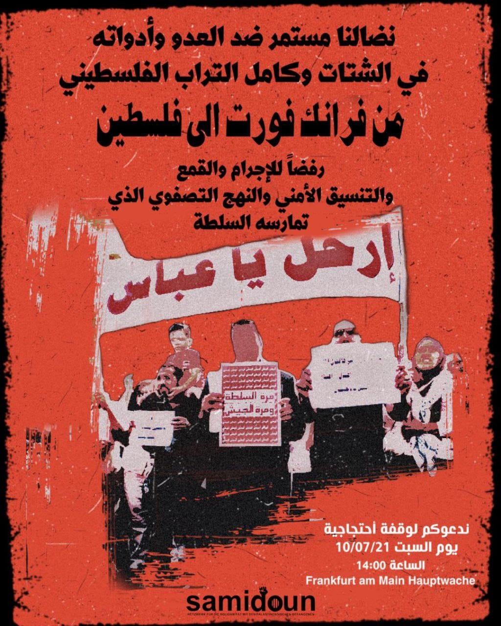 وعليه نؤكد أن لا حرية لفلسطين دون قطع تلك اليد اليمنى، وندعوكم لوقفة إحتجاجية يوم السبت 10.07 الساعة الثانية ظهراً في فرانكفورت Hauptwache لنؤكد أن نضالنا الفلسطيني سيستمر ضد العميل والخائن والمحتل في آن معاً وأن المقاومة وحدها هي من تمثلنا!