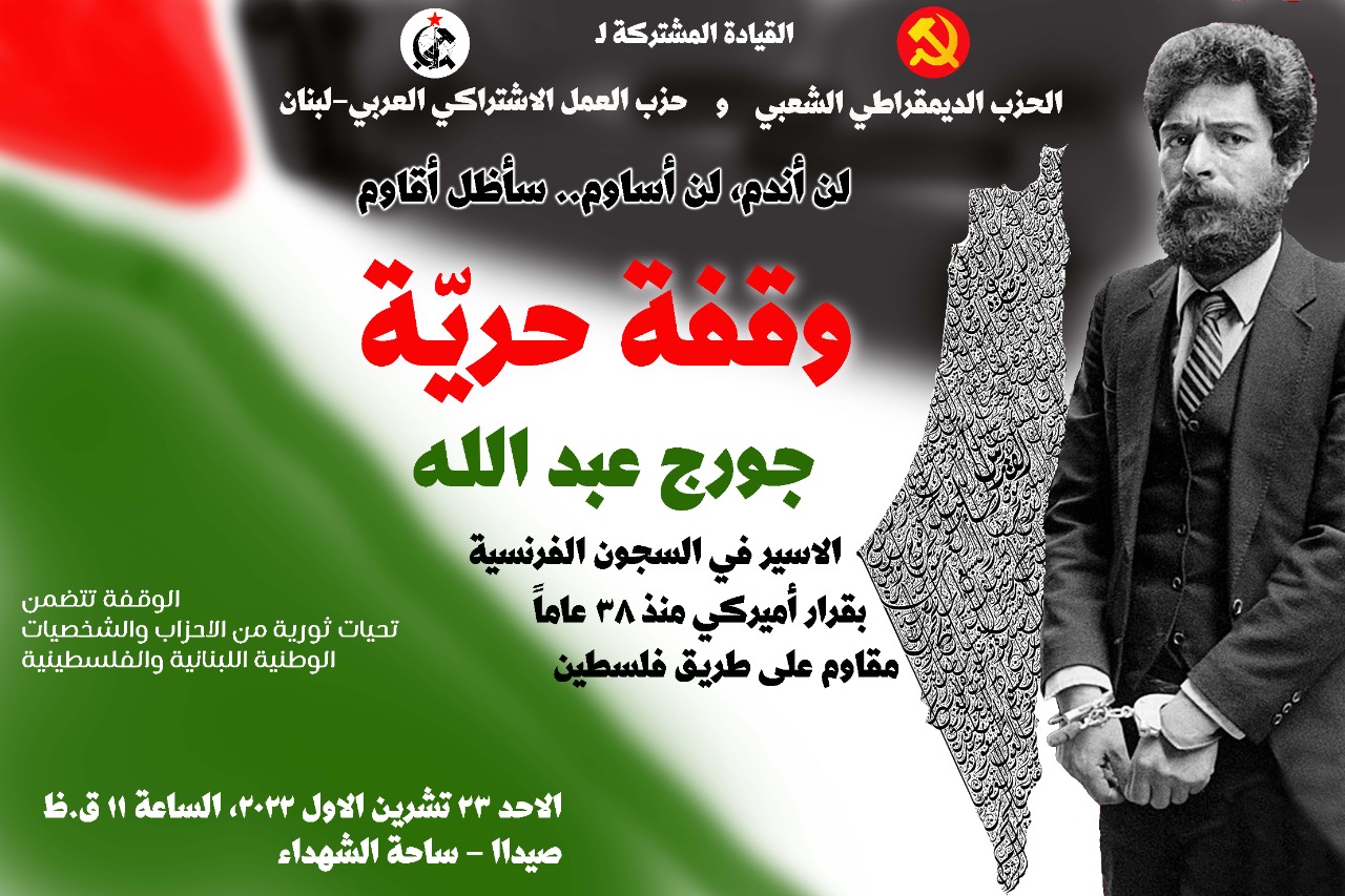 بدعوة من الحزب الديمقراطي الشعبي و حزب العمل الاشتراكي العربي في لبنان، وتحت عنوان “وقفة حرية” تدعوكم القيادة المشتركة إلى المشاركة الواسعة في إسناد صمود جورج عبد الله الأسير في السجون الفرنسية بقرار أمريكي منذ 38 عاماً. يوم الأحد 23 تشرين الأول 2022 الساعة 11 قبل الظهر في مدينة صيدا – ساحة الشهداء