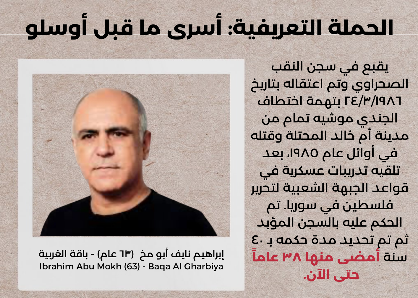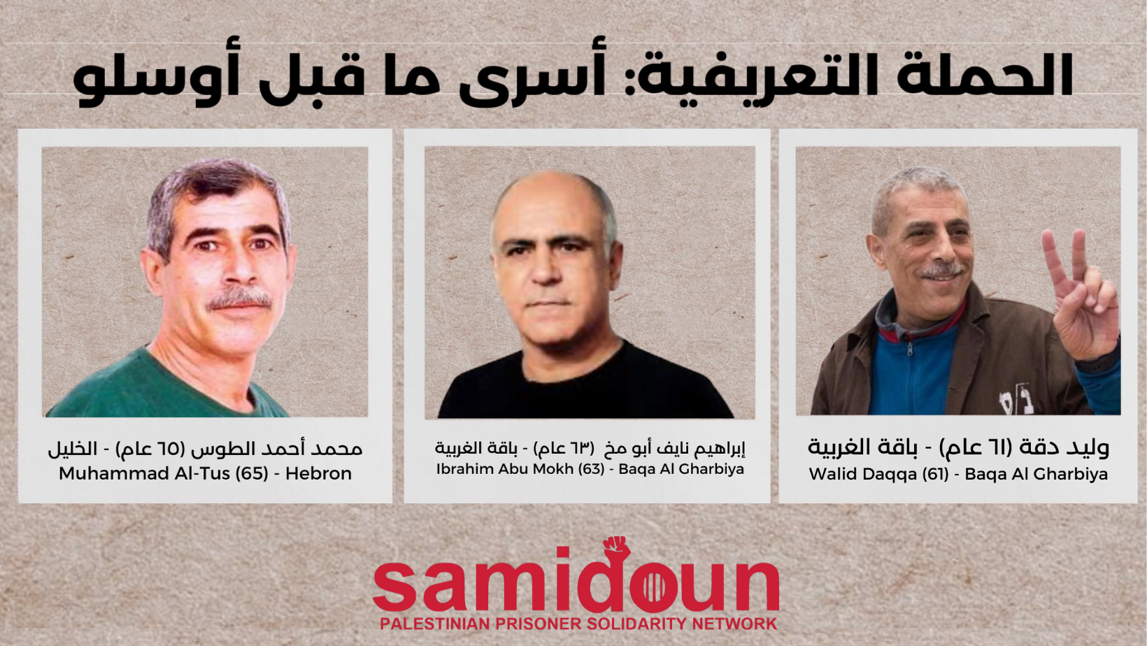 بذلك تعلن شبكة صامدون للدفاع عن الأسرى الفلسطينيين البدأ بحملة تعريفية عن الأسرى الفلسطينيين الذين يقبعون في سجون العدو قبل اتفاقية أوسلو حتى اليوم وعددهم 23. سنقوم أسبوعياً بالتعريف عن ثلاثة أسرى فلسطينيين وتوفير منشورات وبوسترات بإمكانكم طباعتها وتعليقها في مدنكم. شاركوا معنا وأرسلوا إسهاماتكم إلى samidoun@samidoun.net