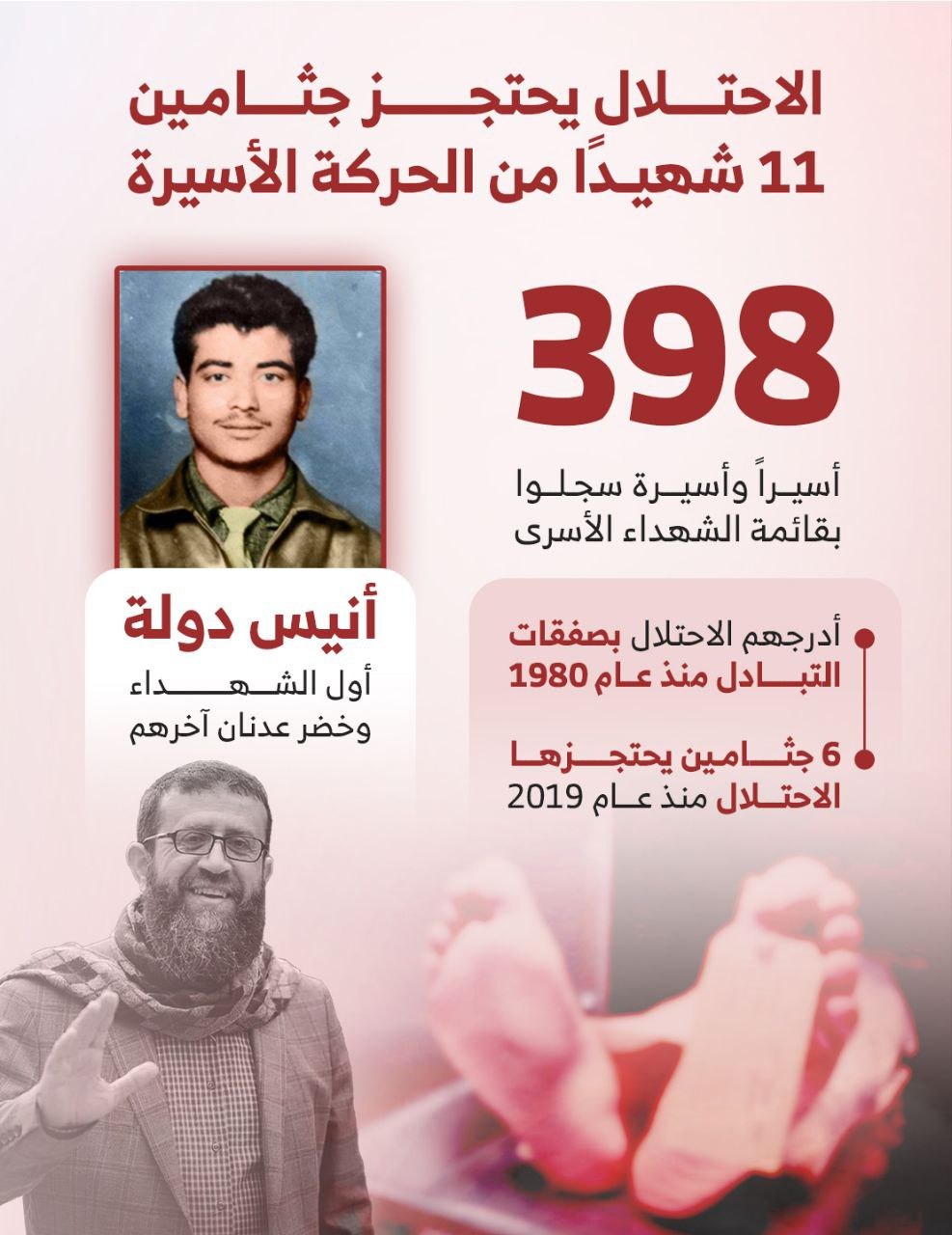 أكّدت “لجنة الطوارئ الوطنية العليا للحركة الوطنية الأسيرة” اليوم الأحد، أن كيان الاحتلال الإسرائيلي يحتجز جثامين 398 شهيدًا وشهيدة بينهم 256 محتجزون في ما يسمى “مقابر الأرقام”