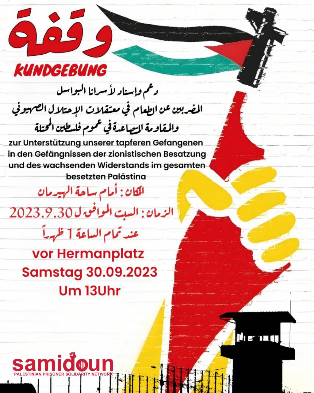 تدعوكم شبكة صامدون للدفاع عن الأسرى الفلسطينيين إلى المشاركة بالوقفة التي ننظمها في برلين يوم السبت ٣٠/٩/٢٠٢٣ إسناداً لأسرانا الأبطال الذين يخوضون معركة الأمعاء الخاوية في وجه السجّان، وتأكيداً على دعمنا المطلق للمقاومة الفلسطينية المتصاعدة في فلسطين من نهرها لبحرها.