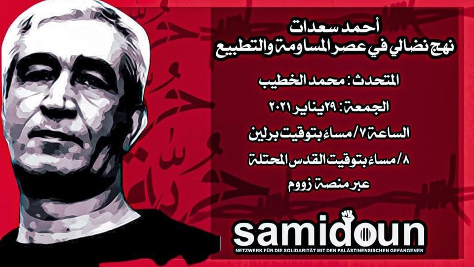 Samidoun Deutschland invites all to participate in an event to discuss the revolutionary path of struggle represented by the imprisoned Palestinian leader Ahmad Sa’adat, as part of the international week of solidarity to free Ahmad Sa’adat. We also plan to discuss the attacks against this revolutionary path organized by the forces of surrender and collaboration since the beginning of the Madrid-Oslo path three decades ago. Because the case of Ahmad Sa’adat does not only implicate Zionist colonialism, but also on the cooperation of the Palestinian Authority with the enemy and its submission to the imperialist powers in the world. In the event we will also address the different facets of the struggle of the Palestinian prisoners in the Zionist prisons, in particular their steadfastness in confrontation and their leadership role in the struggle of the entire Palestinian liberation movement.
