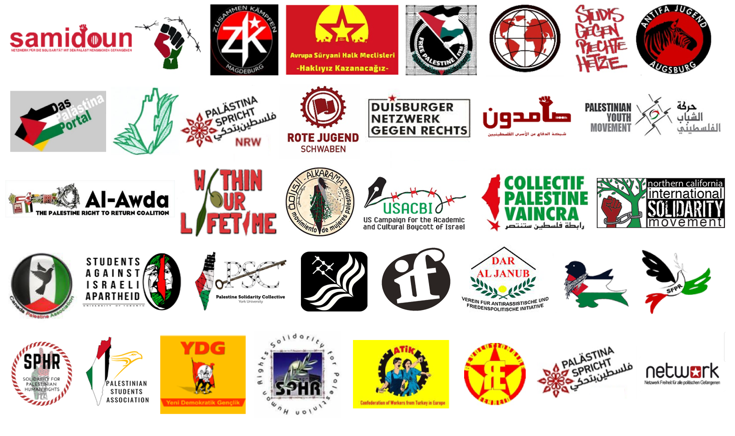 From the left: Samidoun Deutschland (Germany), Palästina Antikolonial (Germany), Zusammen kämpfen Magdeburg (Germany), Volksrat der Suryoye in Europa (Germany), Free Palestine Movement FFM (Germany), Studis gegen rechte hetze (Germany), Antifa Jugend Augsburg (Germany), Internationale Jugendgruppe Siegen (Germany), Das Palästina Portal (Germany), Institut für Palästinakunde e.V. (Germany), Palästina spricht NRW (Germany), Rote Jugend Schwaben(Germany), Duisburger Netzwerk gegen Rechts (Germany), Samidoun Palestinian Prisoner Solidarity Network (international), Palestinian Youth Movement (US), Al-Awda – the Palestine Right to Return Coalition (US), Within Our Lifetime – United for Palestine (US), Alkarama Palestinian Women’s Mobilization (Spain), US Campaign for the Academic and Cultural Boycott of Israel (US), Collectif Palestine Vaincra (France), International Solidarity Movement (ISM) Northern California, Canada Palestine Association (Canada), Students Against Israeli Apartheid – University of Toronto (Canada), Palestine Solidarity Collective at York University (US), National Students for Justice in Palestine (US) – National SJP (US), Internationalt Forum – Middle East Group (Denmark), Dar al Janub – Verein für antirassistische und friedenspolitische Initiative (Austria), McGill Students in Solidarity for Palestinian Human Rights (Canada), University of Waterloo Students for Palestinian Rights (Canada), Solidarity for Palestinian Human Rights – University of British Columbia (Canada), Laurier Palestinian Students Association (Canada), Yeni Demokratik Gençlik YDG (Germany), Solidarity for Palestinian Human Rights – SPHR Queen’s University (Canada), Atik – Confederation of workers from Turkey in Europe (European), Revolutionaire Eenheid (Netherlands), Palästina Spricht (Germany), Netzwerk Freiheit für alle politischen Gefangenen (Germany), Queerproletariatet (Sweden)