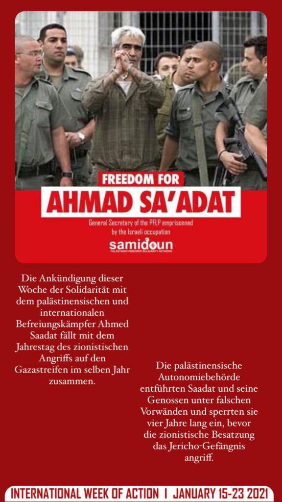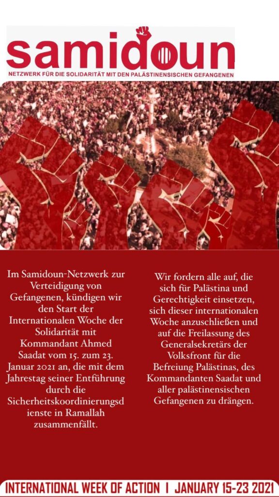 Im Samidoun-Netzwerk zur Verteidigung von Gefangenen kündigen wir den Start der Internationalen Woche der Solidarität mit Kommandant Ahmed Saadat vom 15. zum 23. Januar 2021 an, die mit dem Jahrestag seiner Entführung durch die Sicherheitskoordinierungsdienste in Ramallah zusammenfällt.