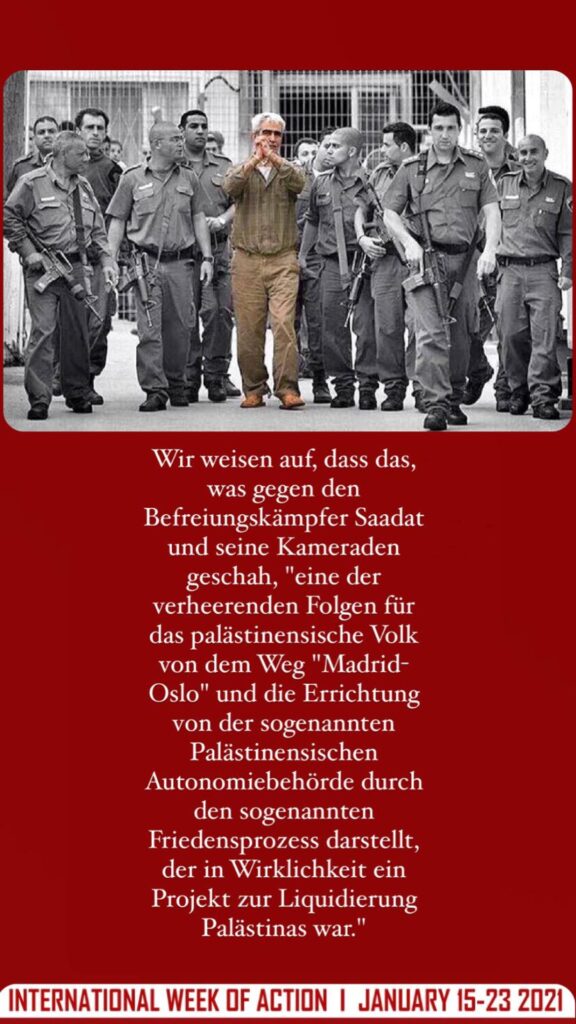 Wir weisen auf, dass das, was gegen den Befreiungskämpfer Saadat und seine Kameraden geschah, “eine der verheerenden Folgen für das palästinensische Volk von dem Weg “Madrid-Oslo” und die Errichtung von der sogenannten Palästinensischen Autonomiebehörde durch den sogenannten Friedensprozess darstellt, der in Wirklichkeit ein Projekt zur Liquidierung Palästinas war.”