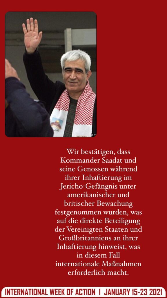 Wir bestätigen, dass Kommander Saadat und seine Genossen während ihrer Inhaftierung im Jericho-Gefängnis unter amerikanischer und britischer Bewachung festgenommen wurden, was auf die direkte Beteiligung der Vereinigten Staaten und Großbritanniens an ihrer Inhaftierung hinweist, was in diesem Fall internationale Maßnahmen erforderlich macht.