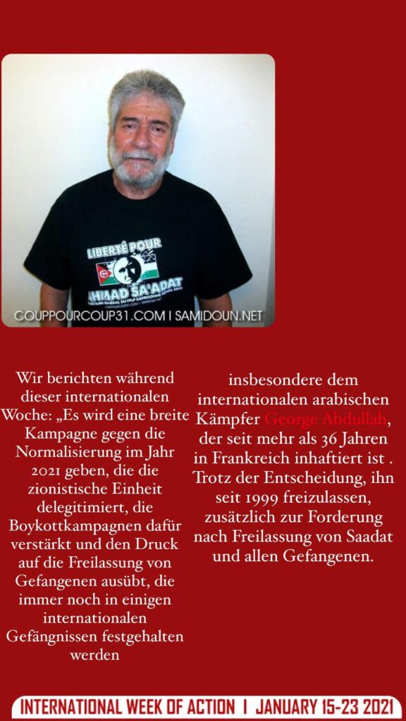 Wir berichten während dieser internationalen Woche: „Es wird eine breite Kampagne gegen die Normalisierung im Jahr 2021 geben, die die zionistische Einheit delegitimiert, die Boykottkampagnen dafür verstärkt und den Druck auf die Freilassung von Gefangenen ausübt, die immer noch in einigen internationalen Gefängnissen festgehalten werden, insbesondere dem internationalen arabischen Kämpfer George Abdullah, der seit mehr als 36 Jahren in Frankreich inhaftiert ist .Trotz der Entscheidung, ihn seit 1999 freizulassen, zusätzlich zur Forderung nach Freilassung von Saadat und allen Gefangenen.