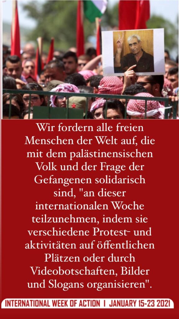 Wir fordern alle freien Menschen der Welt auf, die mit dem palästinensischen Volk und der Frage der Gefangenen solidarisch sind, “an dieser internationalen Woche teilzunehmen, indem sie verschiedene Protest- und aktivitäten auf öffentlichen Plätzen oder durch Videobotschaften, Bilder und Slogans organisieren”.