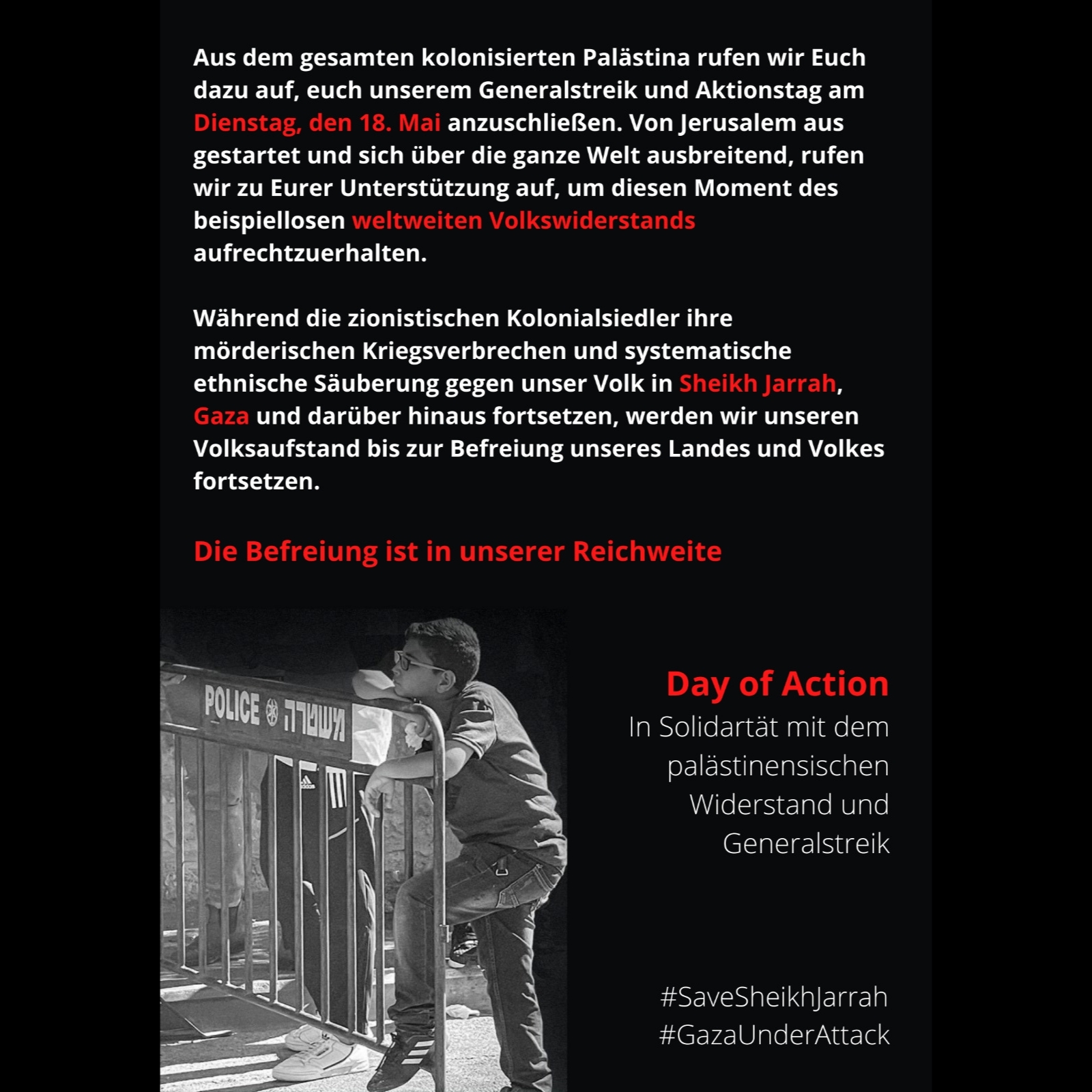 Wir laden Euch als Palästinensische Jugend ein, am Dienstag den 18. Main 2021, zum Generalstreik und zur Organisation von nationalen Widerstands-Veranstaltungen, in Euren Städten und Gemeinden und Flüchtlingslagern, und in allen Gebieten, wo ihr Euch befindet. Bleiben wir in den Straßen und setzen wir den Widerstand fort.