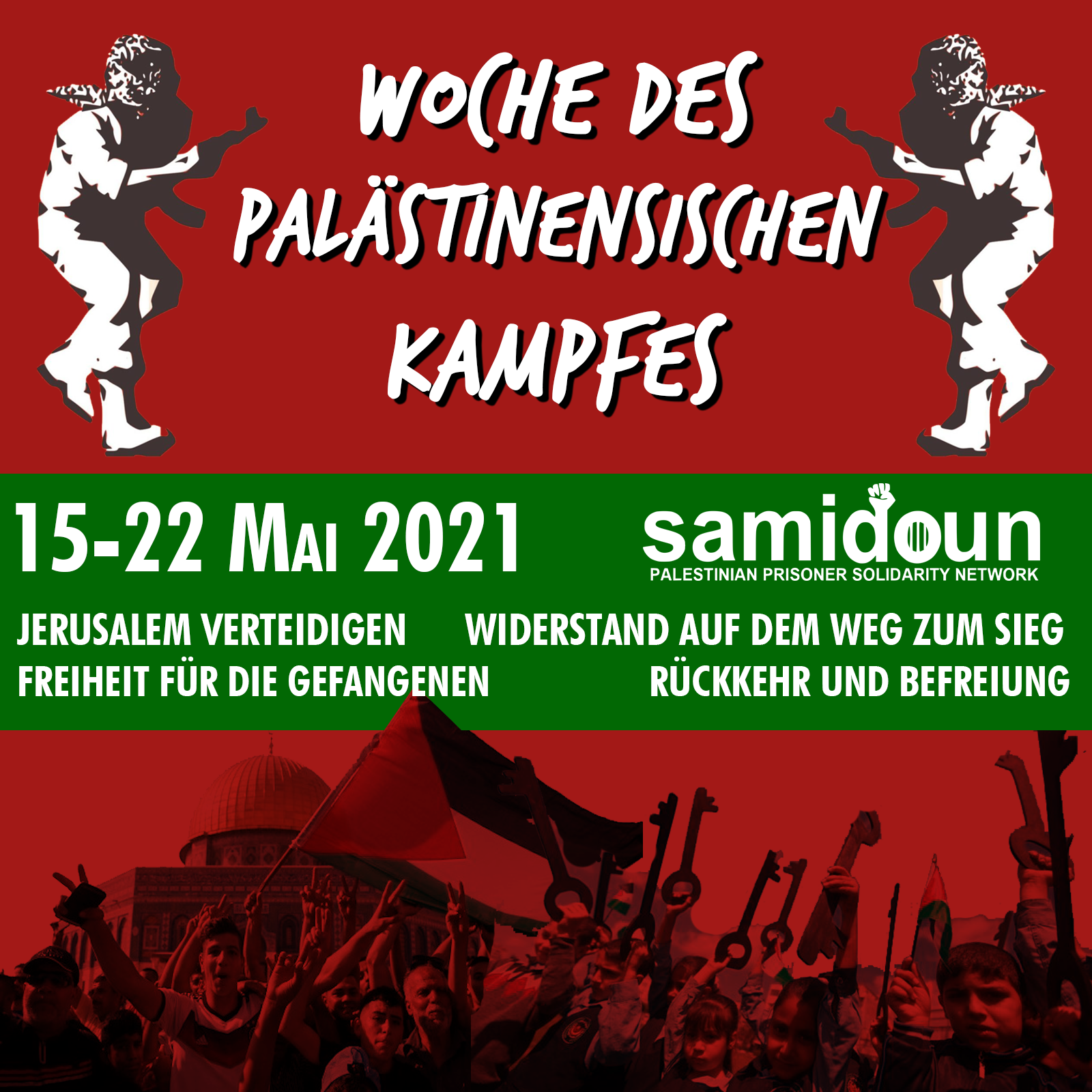 Samidoun Palestinian Prisoner Solidarity Network ruft Organisationen, Aktivist:innen, soziale Bewegungen und Freunde Palästinas überall zu Aktionen auf, um Jerusalem zu verteidigen, für das Recht der Palästinenser:innen auf Rückkehr zu demonstrieren und für Gerechtigkeit und Befreiung Palästinas einzutreten. Wir schließen uns dem Aufruf zur Aktionswoche für den palästinensischen Kampf vom 15. bis 22. Mai 2021 an: werdet aktiv, marschiert, demonstriert, protestiert, organisiert und kämpft für Palästina!