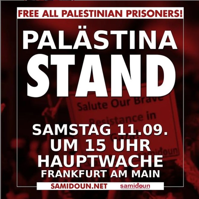 يمارس أسرانا في سجون العدو في هذه الأثناء حقهم الطبيعي بالتصدي لمحاولات التنكيل بهم، ويقابل هذا الفعل المقاوم مظاهرات داعمة في جميع أنحاء فلسطين المحتلة. انتصاراً لأسرانا في معركتهم نحو الحرية ضد السّجان الصهيوني، شاركونا بالوقفة يوم السبت في تمام الساعة الثالثة، ساحة الـHauptwache في مدينة فرانكفورت.