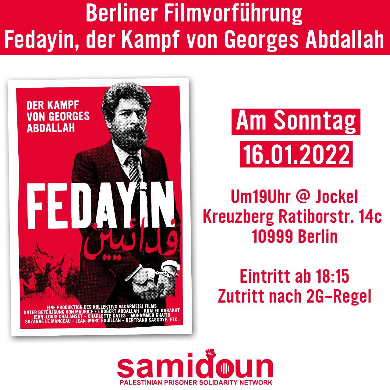 Samidoun Deuschland organisiert die Vorführung des Films Fedayin, der Kampf von Georges Abdallah, mit anschließender Diskussion. Fedayin ist ein Film, der den Kampf von Georges Ibrahim Abdullah und den Palästinensern:innen erklärt. Der Eintritt ist frei. Kommt zahlreich!