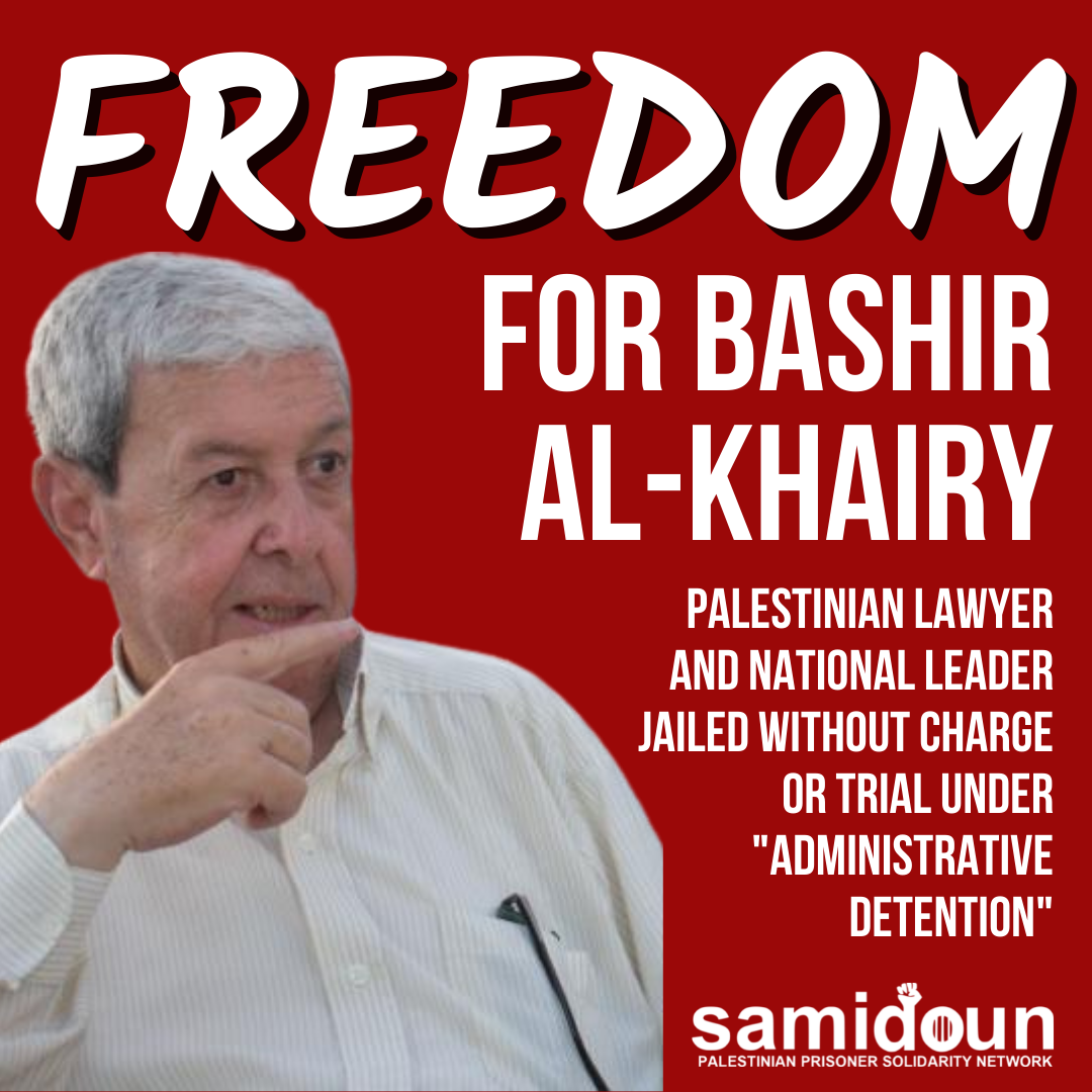 Bashir Al-Khairy, 79-jähriger palästinensischer Rechtsanwalt, langjähriger Linkenführer und Menschenrechtsverteidiger, wird derzeit von der zionistischen Besatzung ohne Anklage oder Prozess inhaftiert. Die Besatzungstruppen drangen am 29. Oktober 2021 in sein Haus ein, nahmen ihn fest und brachten ihn zum Militärstützpunkt Ofer. Nach mehrfachen Verlängerungen seiner Haft und einer ersten Liste von Anklagen vor einem Militärgericht wurde gegen ihn Verwaltungshaft verhängt, d. h. eine Inhaftierung ohne Anklage oder Gerichtsverfahren auf der Grundlage “geheimer Beweise”, nachdem er zunächst gegen Kaution freigelassen worden war. Seine Verwaltungshaft wird am 28. April 2022 enden, und palästinensische Gefangene mobilisieren, um seine Freilassung nach Ablauf der Haft zu fordern – und rufen Menschen in aller Welt auf, sich ihnen anzuschließen.