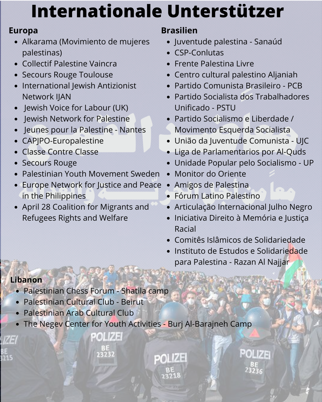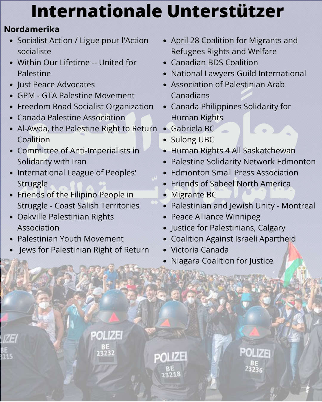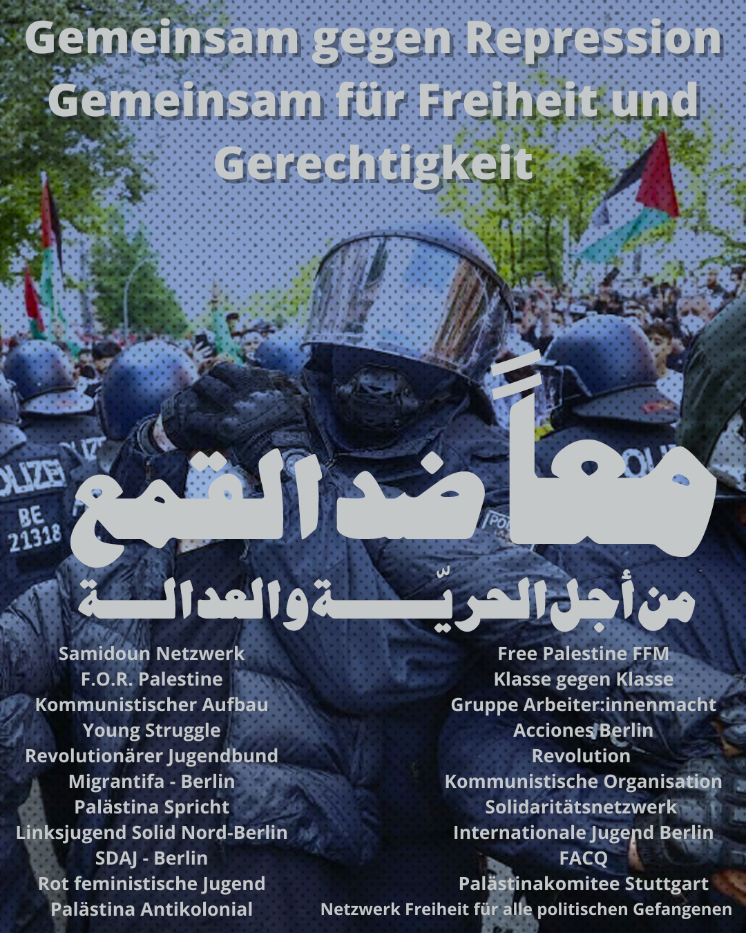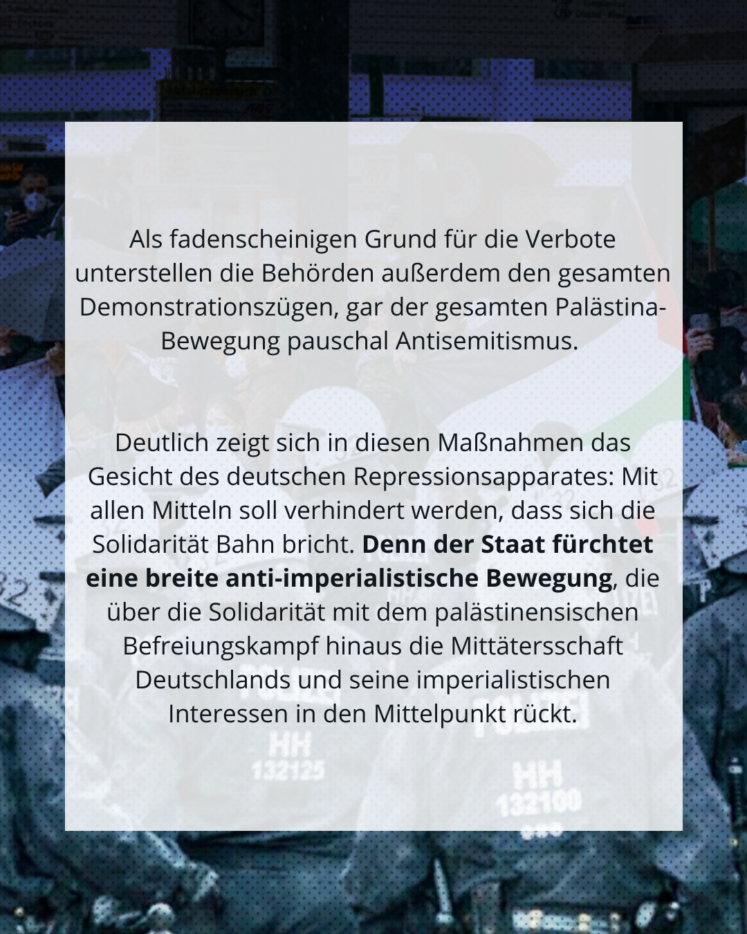 Als fadenscheinigen Grund für die Verbote unterstellen die Behörden außerdem den gesamten Demonstrationszügen, gar der gesamten Palästina-Bewegung pauschal Antisemitismus. Deutlich zeigt sich in diesen Maßnahmen das Gesicht des deutschen Repressionsapparates: Mit allen Mitteln soll verhindert werden, dass sich die Solidarität Bahn bricht. Denn der Staat fürchtet eine breite anti-imperialistische Bewegung, die über die Solidarität mit dem palästinensischen Befreiungskampf hinaus die Mittätersschaft Deutschlands und seine imperialistischen Interessen in den Mittelpunkt rückt.
