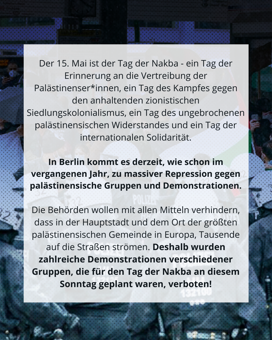In Berlin kommt es derzeit, wie schon im vergangenen Jahr, zu massiver Repression gegen palästinensische Gruppen und Demonstrationen. Die Behörden wollen mit allen Mitteln verhindern, dass in der Hauptstadt und dem Ort der größten palästinensischen Gemeinde in Europa, Tausende auf die Straßen strömen. Deshalb wurden zahlreiche Demonstrationen verschiedener Gruppen, die für den Tag der Nakba an diesem Sonntag geplant waren, verboten!