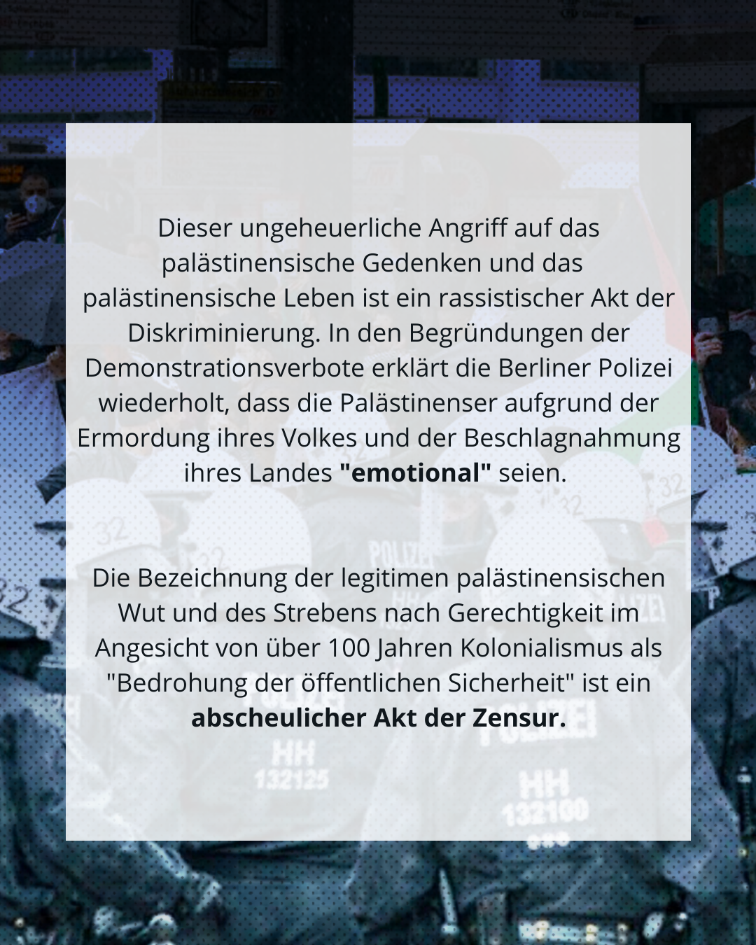 Dieser ungeheuerliche Angriff auf das palästinensische Gedenken und das palästinensische Leben ist ein rassistischer Akt der Diskriminierung. In den Begründungen der Demonstrationsverbote erklärt die Berliner Polizei wiederholt, dass die Palästinenser aufgrund der Ermordung ihres Volkes und der Beschlagnahmung ihres Landes “emotional” seien. Die Bezeichnung der legitimen palästinensischen Wut und des Strebens nach Gerechtigkeit im Angesicht von über 100 Jahren Kolonialismus als “Bedrohung der öffentlichen Sicherheit” ist ein abscheulicher Akt der Zensur.