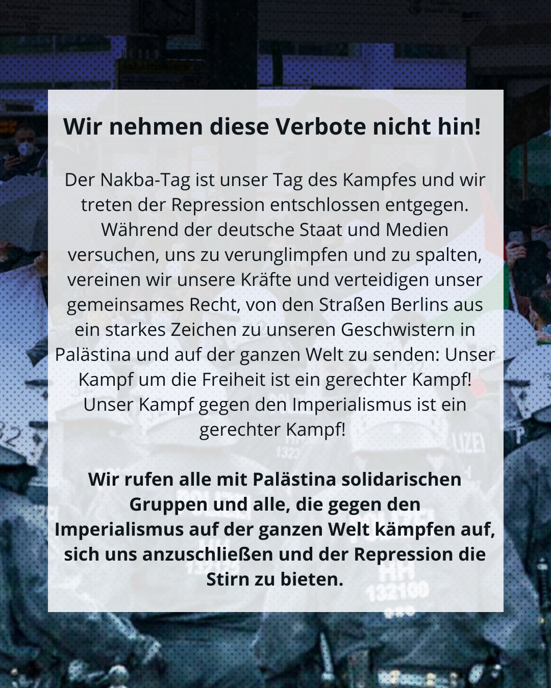 Wir nehmen diese Verbote nicht hin! Der Nakba-Tag ist unser Tag des Kampfes und wir treten der Repression entschlossen entgegen. Während der deutsche Staat und Medien versuchen, uns zu verunglimpfen und zu spalten, vereinen wir unsere Kräfte und verteidigen unser gemeinsames Recht, von den Straßen Berlins aus ein starkes Zeichen zu unseren Geschwistern in Palästina und auf der ganzen Welt zu senden: Unser Kampf um die Freiheit ist ein gerechter Kampf! Unser Kampf gegen den Imperialismus ist ein gerechter Kampf! Wir rufen alle mit Palästina solidarischen Gruppen und alle, die gegen den Imperialismus auf der ganzen Welt kämpfen auf, sich uns anzuschließen und der Repression die Stirn zu bieten.