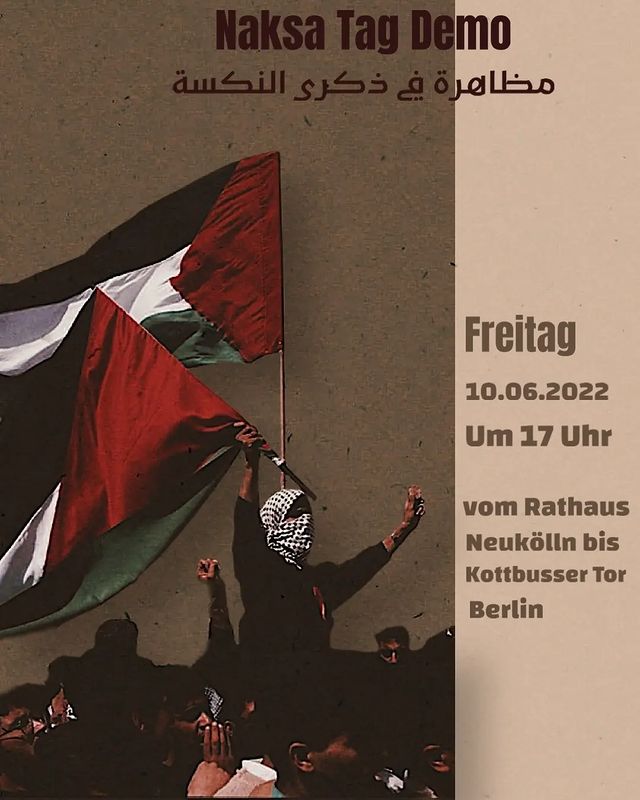 Wir, ein Bündnis revolutionärer Gruppen aus Berlin, rufen am Freitag, dem 10.06.2022 um 17 Uhr am Rathaus Neukölln zu einer Demonstration in Solidarität mit dem palästinensischen Befreiungskampf auf.