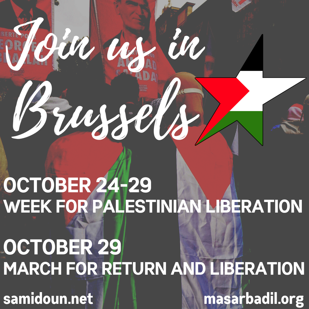Schließt euch Samidoun Netzwerk zur Verteidigung der palästinensischen Gefangenen in Brüssel zwischen dem 24. und 29. Oktober 2022 an, um gemeinsam mit Masar Badil, der Palästinensischen Alternativen Revolutionären Pfad Bewegung, an der Internationalen Aktionswoche für die Befreiung Palästinas teilzunehmen. Die Aktionswoche endet mit dem Marsch für Rückkehr und Befreiung am Samstag, den 29. Oktober.