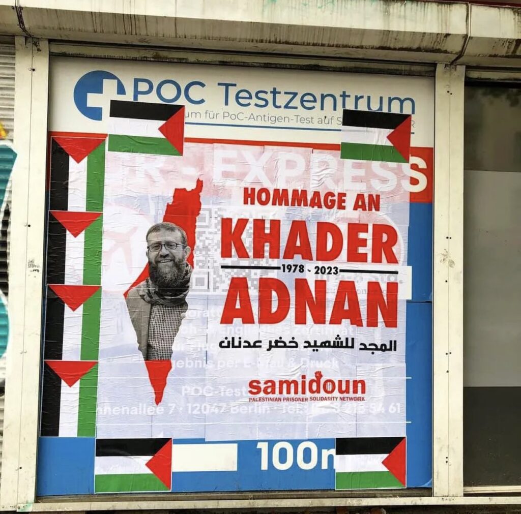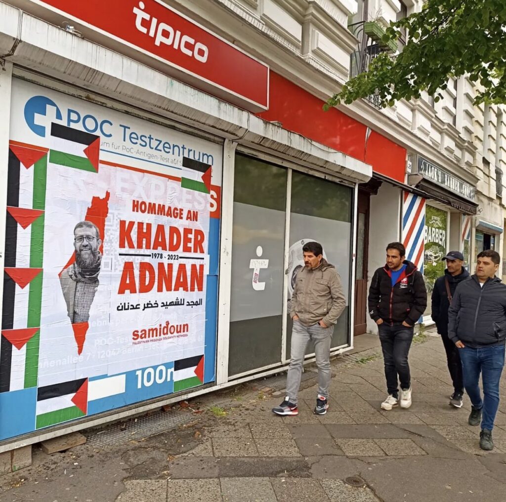 In Berlin, hat Samidoun Deutschland seine Bemühungen fortgesetzt, den Kampf und das Opfer von Khader Adnan hervorzuheben, auch wenn es sich gegen Repressionen wehrt. Nach den ersten Bannern und Plakaten, die zum Gedenken an Adnan aufgehängt wurden, hat Samidoun Deutschland ein neues großes Wandbild zu seinem Gedenken gestaltet. Dies ging Hand in Hand mit der internationalen Kampagne gegen die antipalästinensische Repression in Deutschland und dem Aufruf zur Teilnahme an der Demonstration zum Gedenken an 75 Jahre Nakba am Sonntag, den 14. Mai um 14 Uhr vom Rathaus Neuköln zum Hermannplatz.