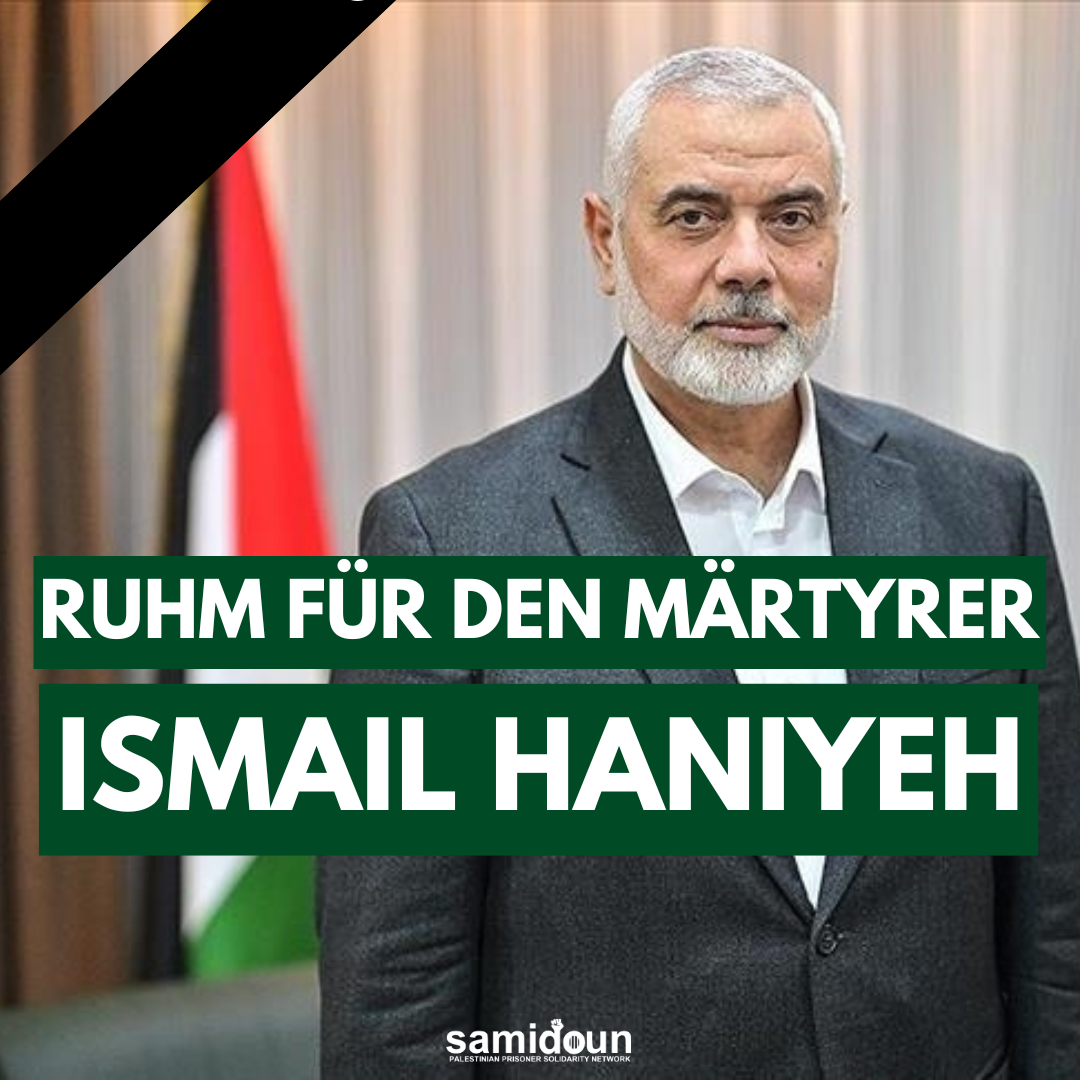 Samidoun Palestinian Prisoners Solidarity Network schließt sich der gesamten palästinensischen Nationalbewegung an und verurteilt die Ermordung von Ismail Haniyeh, Abu al-Abed, dem Vorsitzenden des Politbüros der Hamas, der palästinensischen islamischen Widerstandsbewegung, in Teheran (Iran), trauert um ihn und gedenkt seines Lebens.