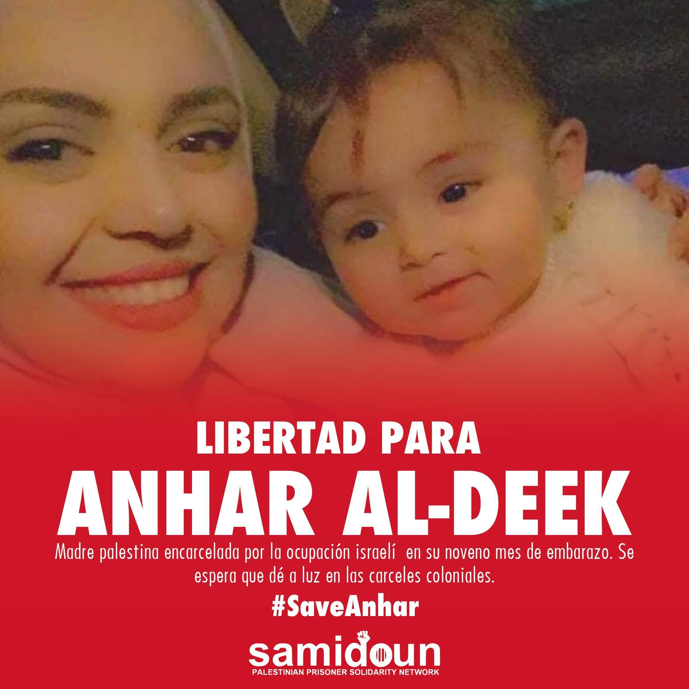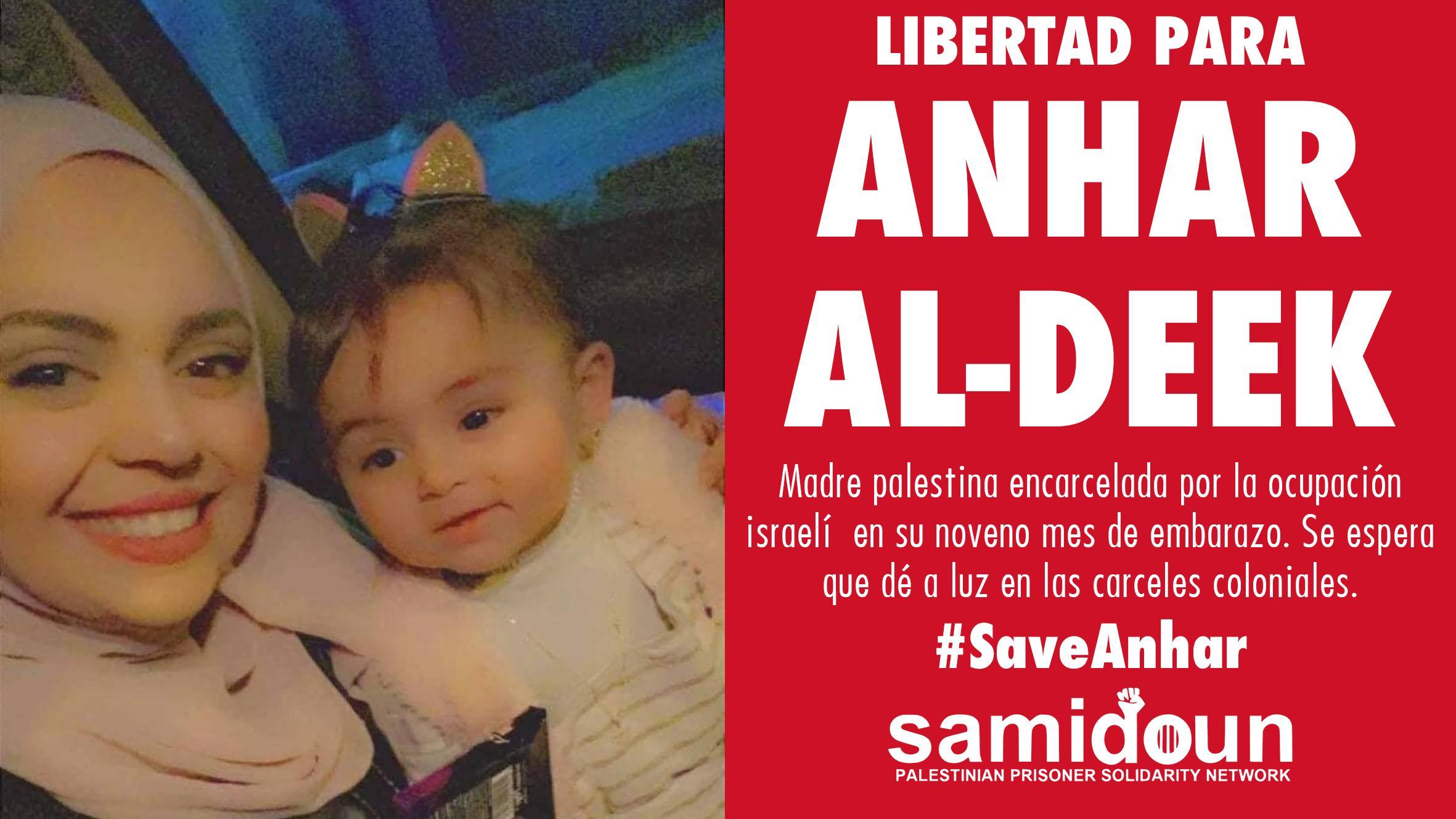 La Red de Solidaridad con los Presos Palestinos de Samidoun se une a los organizadores de toda Palestina y de todo el mundo para alzar nuestras voces y nuestras palabras y exigir la liberación inmediata de Anhar al-Deek. Instamos a todos los partidarios de la justicia en Palestina a unirse a la campaña para #SalvarAnhar y a su hijo. Actúa para apoyar a Anhar al-Deek y exigir la libertad de las mujeres palestinas, de los niños palestinos y de toda Palestina, desde el río hasta el mar.