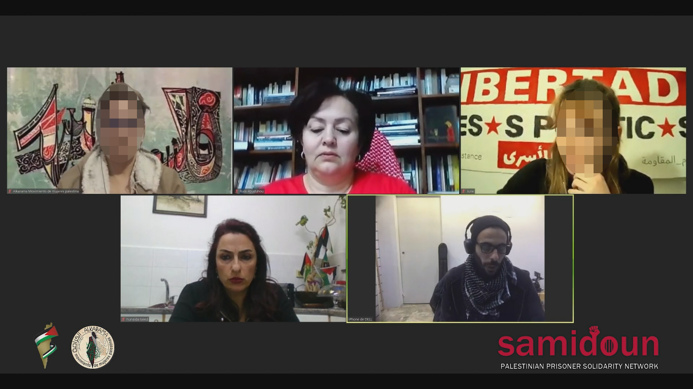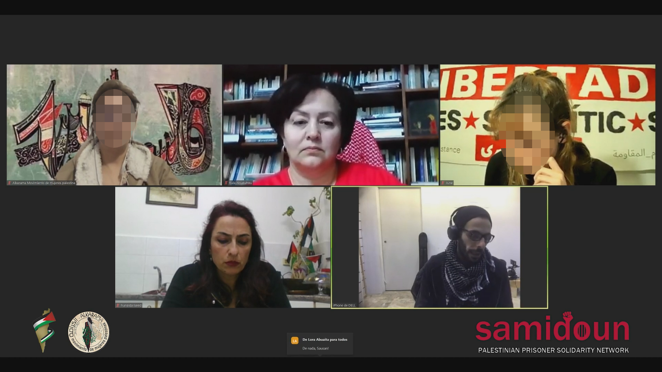 Ni la pandemia, ni las prohibiciones de reuniones en espacios cerrados, ni la cancelación de eventos en el Estado español pudo impedir que las activistas de Samidoun España paralizaran su trabajo por Palestina. Así que en febrero de 2021 organizaron, junto al movimiento de mujeres palestinas Alkarama, un conversatorio online con la exprisionera Rula Abu Dehu y el exprisionero Saad Omar, quienes dieron su testimonio sobre las torturas recibidas en las cárceles sionistas y explicaron cómo opera el sistema de tortura israelí dentro de las cárceles, así como los objetivos que buscan alcanzar con la sistematización de las técnicas de violencia física y psicológica hacia los cuerpos palestinos.