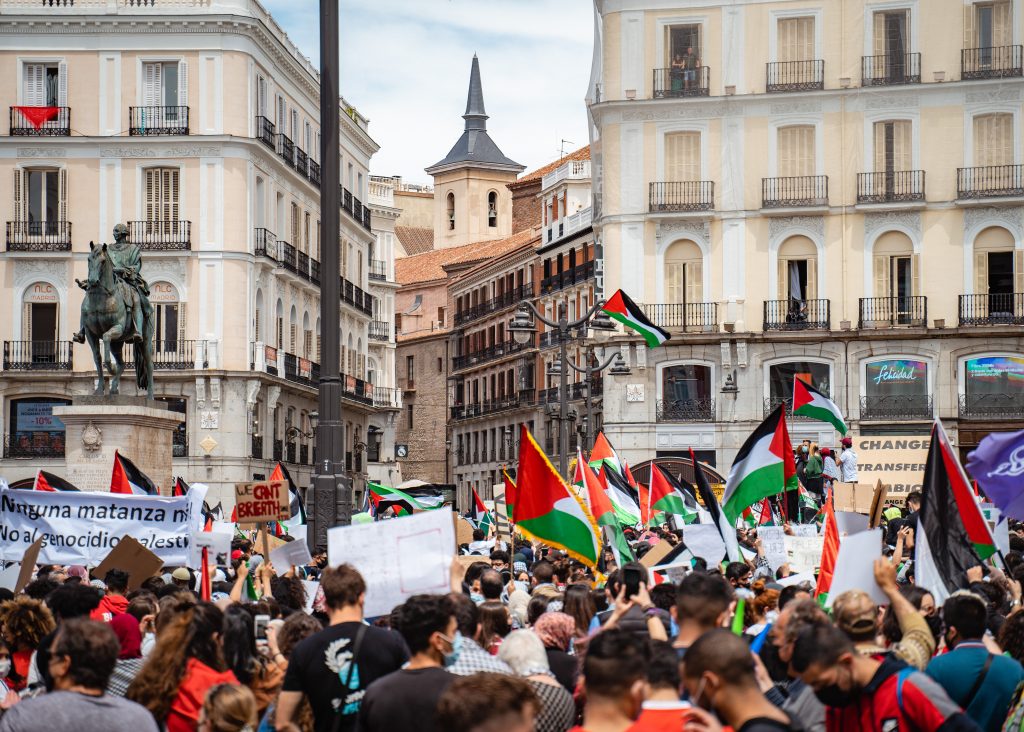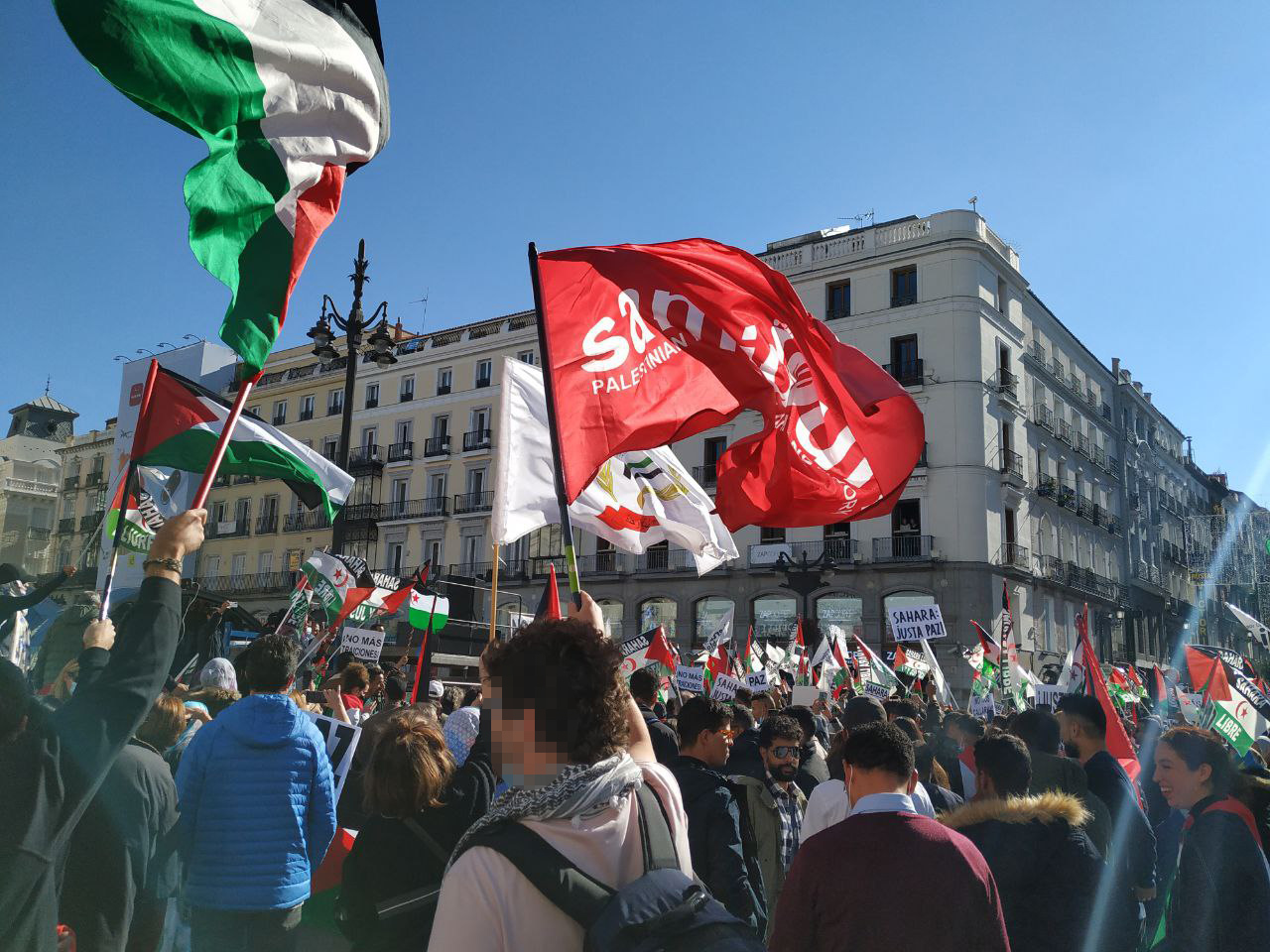 La manifestación terminó en el núcleo de Madrid, en la céntrica Plaza del Sol, donde miles de manifestantes pararon su marcha para gritar que el colonialismo israelí debía caer urgentemente.