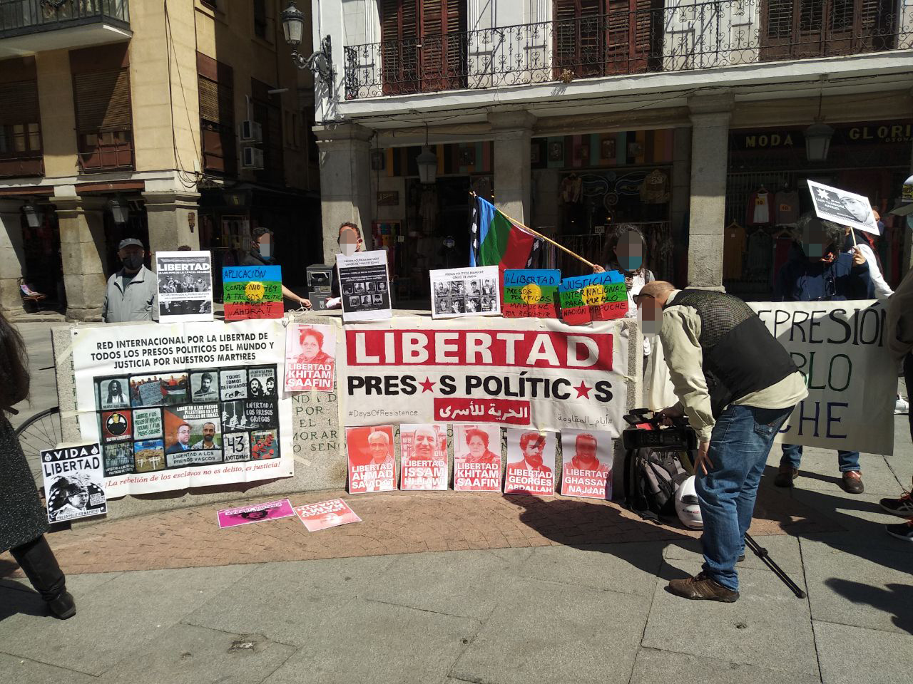 En abril, en el día internacional de los prisioneros políticos, convocamos una concentración enfrente del Ministerio de Exteriores en Madrid. En alianza con las activistas mapuches, mostramos nuestro compromiso y solidaridad con los prisioneros políticos palestinos y en contra de la represión y el encarcelamiento de las luchadoras mapuches. Llenamos la plaza situada enfrente de la entrada de pancartas, carteles, banderas e imágenes de algunos de los 4.500 prisioneros políticos en las cárceles israelíes. Por supuesto, allí demandamos al Ministerio de Exteriores español que cortase inmediatamente relaciones con el Estado colonial israelí si no quiere terminar sentado, tarde o temprano, en un banquillo siendo juzgado por complicidad en crímenes de lesa humanidad.