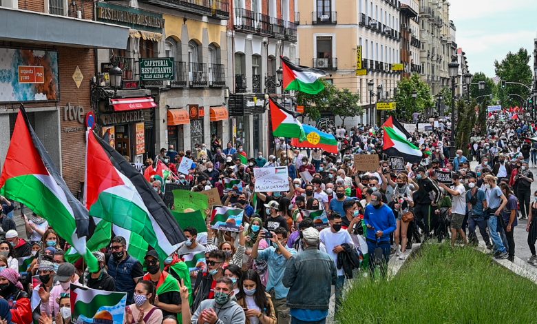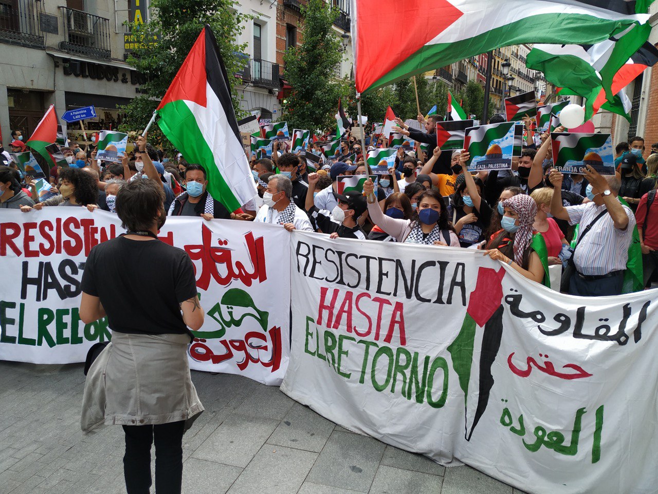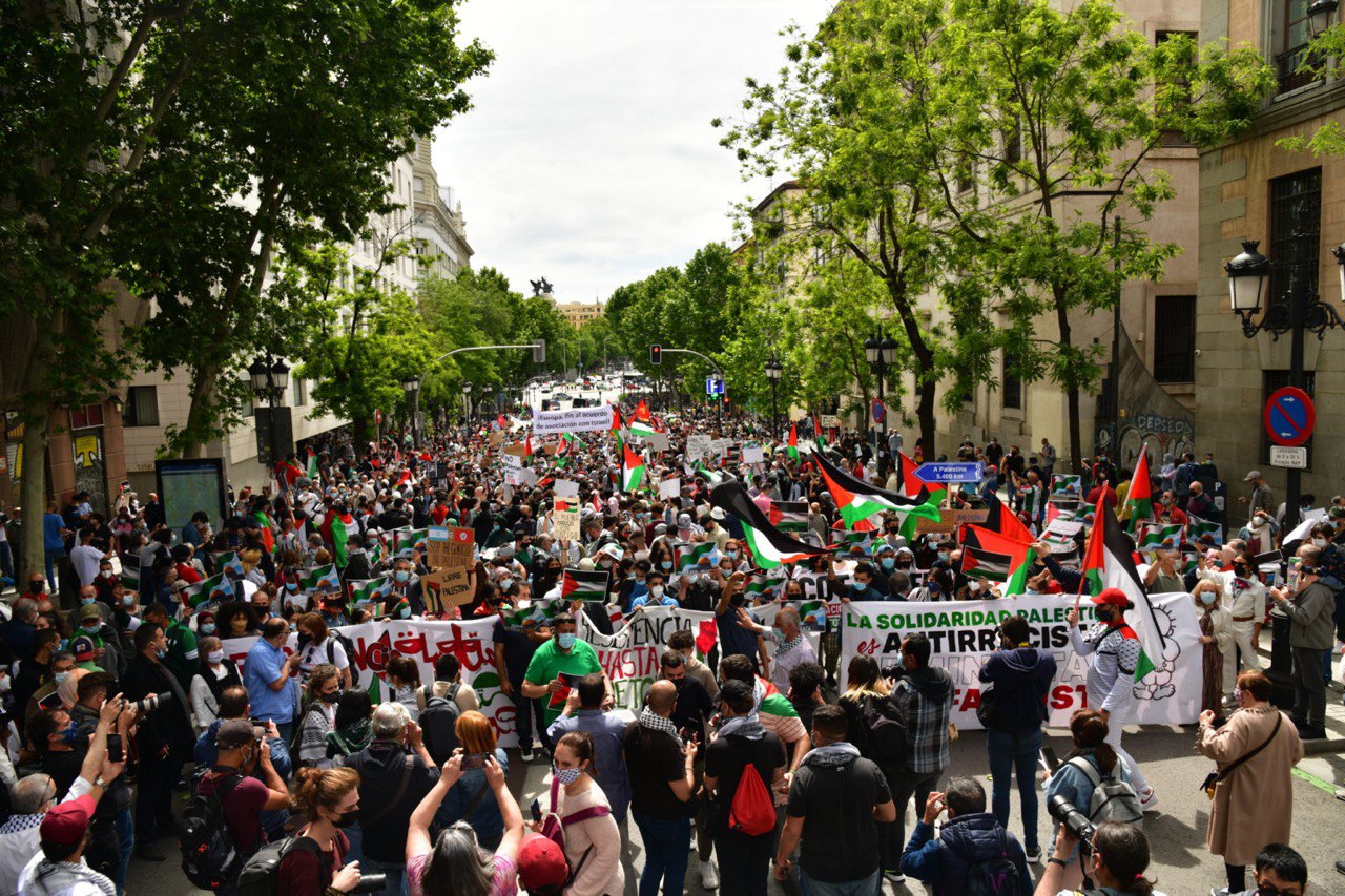 El 15 de mayo, y en medio de una oleada de manifestaciones a nivel internacional en repulsa por la agresión sionista al gueto de Gaza que asesinó mediante bombardeos aéreos a más de 250 palestinos, de los cuales más de 65 eran menores edad, así como contra las incursiones del ejército ocupante en la mezquita de Al Aqsa y el desplazamiento de las familias palestinas del barrio de Sheikh Jarrah, las activistas de Samidoun España convocaron una manifestación en Madrid que reunió a miles de personas en una de las marchas más multitudinarias de los últimos años en solidaridad con Palestina.