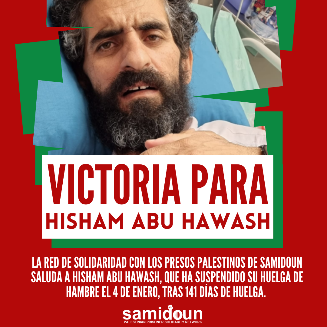 La Red de Solidaridad con los Presos Palestinos de Samidoun saluda a Hisham Abu Hawash, que ha suspendido su huelga de hambre el 4 de enero, tras 141 días de huelga. Conseguirá su libertad el 26 de febrero. La victoria de Abu Hawash muestra el poder de la resistencia de los presos para ganar su libertad, del brazo del pueblo palestino y su resistencia, del pueblo árabe y de la causa internacional de justicia y liberación. Ahora es el momento de redoblar nuestros esfuerzos para liberar a todos los presos palestinos y acabar con el sistema de detención administrativa -y con todo el régimen israelí-.