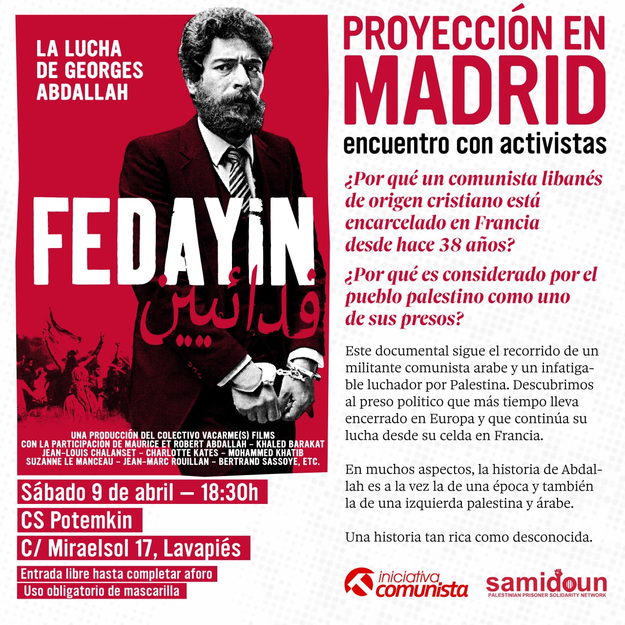 Proyectamos “Fedayin: La lucha de George Abdallah”. Pásate por el local de