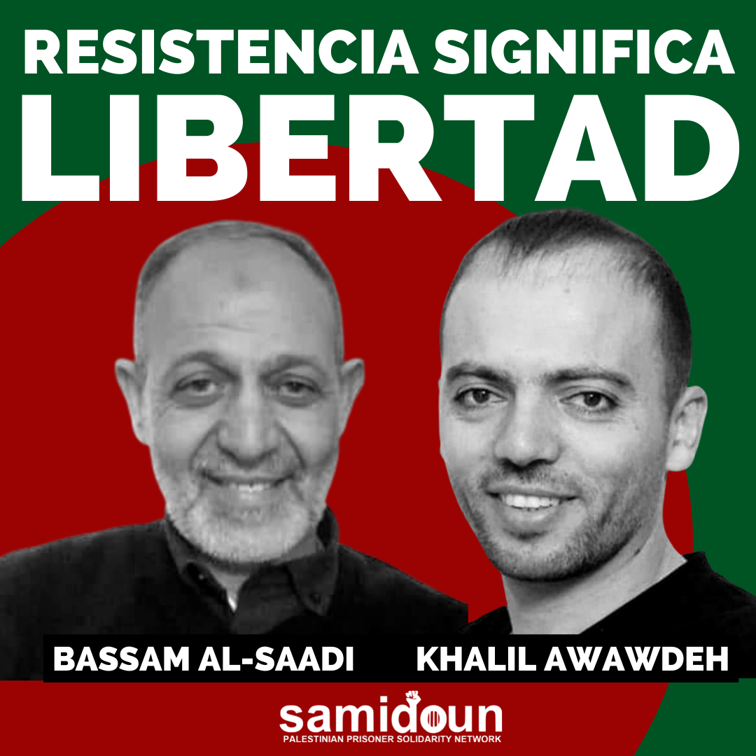La Red de Solidaridad con los Prisioneros Palestinos de Samidoun enfatiza la necesidad de construir sobre los logros y sacrificios del pueblo palestino y su firme Resistencia, afirmando que los prisioneros palestinos están en el centro de la lucha de liberación. No debemos disminuir nuestros esfuerzos, sino intensificar nuestra organización y acción para liberar a Khalil Awawdeh, Bassam al-Saadi y todos los 4.700 líderes de la resistencia palestina y luchadores por la libertad encerrados tras las rejas sionistas, que continúan señalando el camino a seguir para la liberación de Palestina del río al mar.