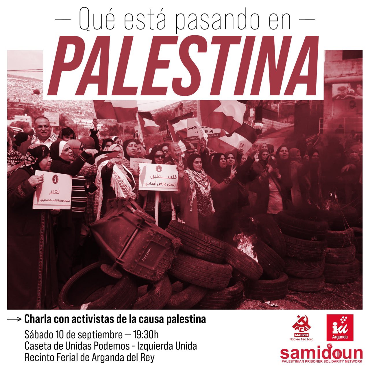 Os invitamos a conocer de primera mano la situación en Palestina gracias al colectivo Samidoun España. El evento tendrá lugar en la caseta de Unidas Podemos Izquierda Unida del recinto ferial de Arganda, nos vemos el sábado a las 19.30!