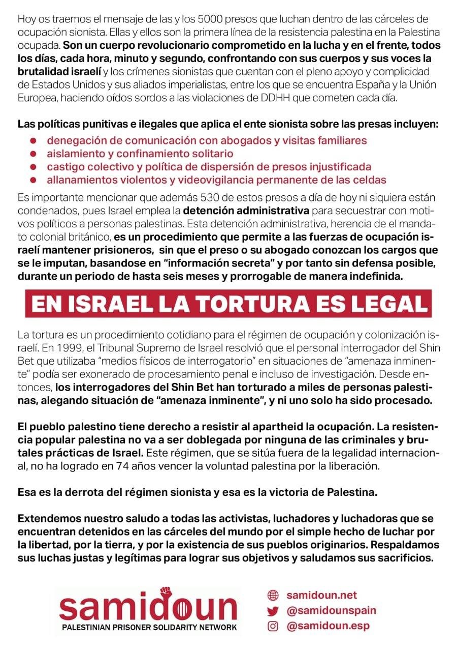 Por otro lado, Samidoun se encargó de difundir la campaña por el fin de la detención administrativa (#EndTheAdministrativeDetentión) y dar a conocer la valiente lucha de los treinta prisioneros políticos palestinos que llevan más de 10 días en huelga de hambre en las prisiones israelíes, en protesta por la detención arbitraria que los mantiene secuestrados ilimitadamente sin cargos, ni juicios, ni defensa legal posible.