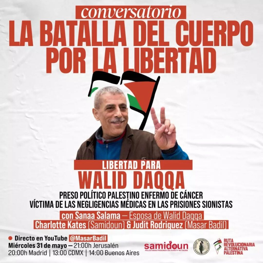 Acude al conversatorio online que tendremos el próximo miércoles 31 a las 20:00h (Madrid) junto a su esposa Sanaa Salama, quien nos actualizará sobre la situación en que se encuentra, así como de la campaña de apoyo #Free_Walid_Daqqah