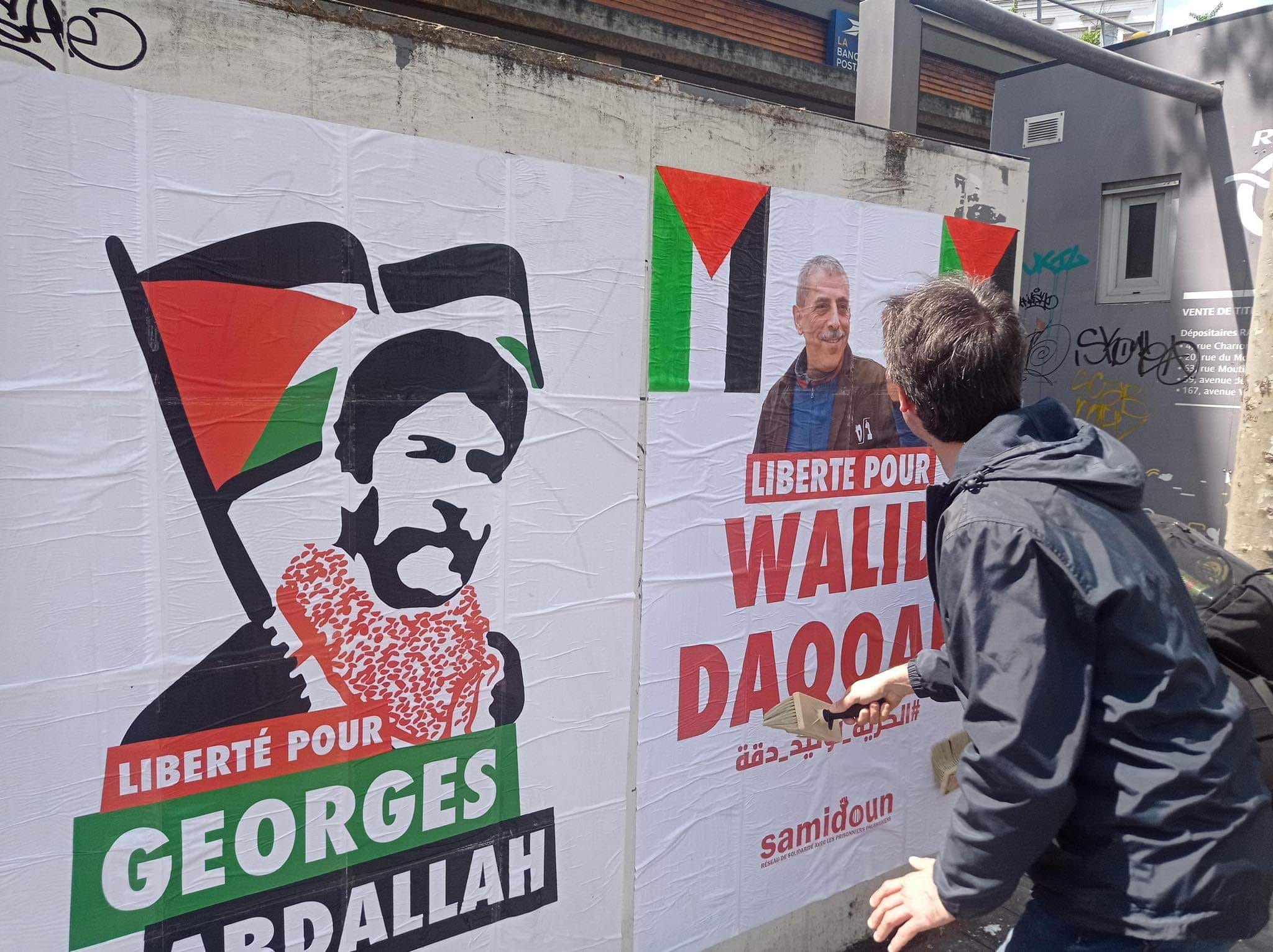Joven pegando carteles de Walid Daqqah y George Abdallah en Paris