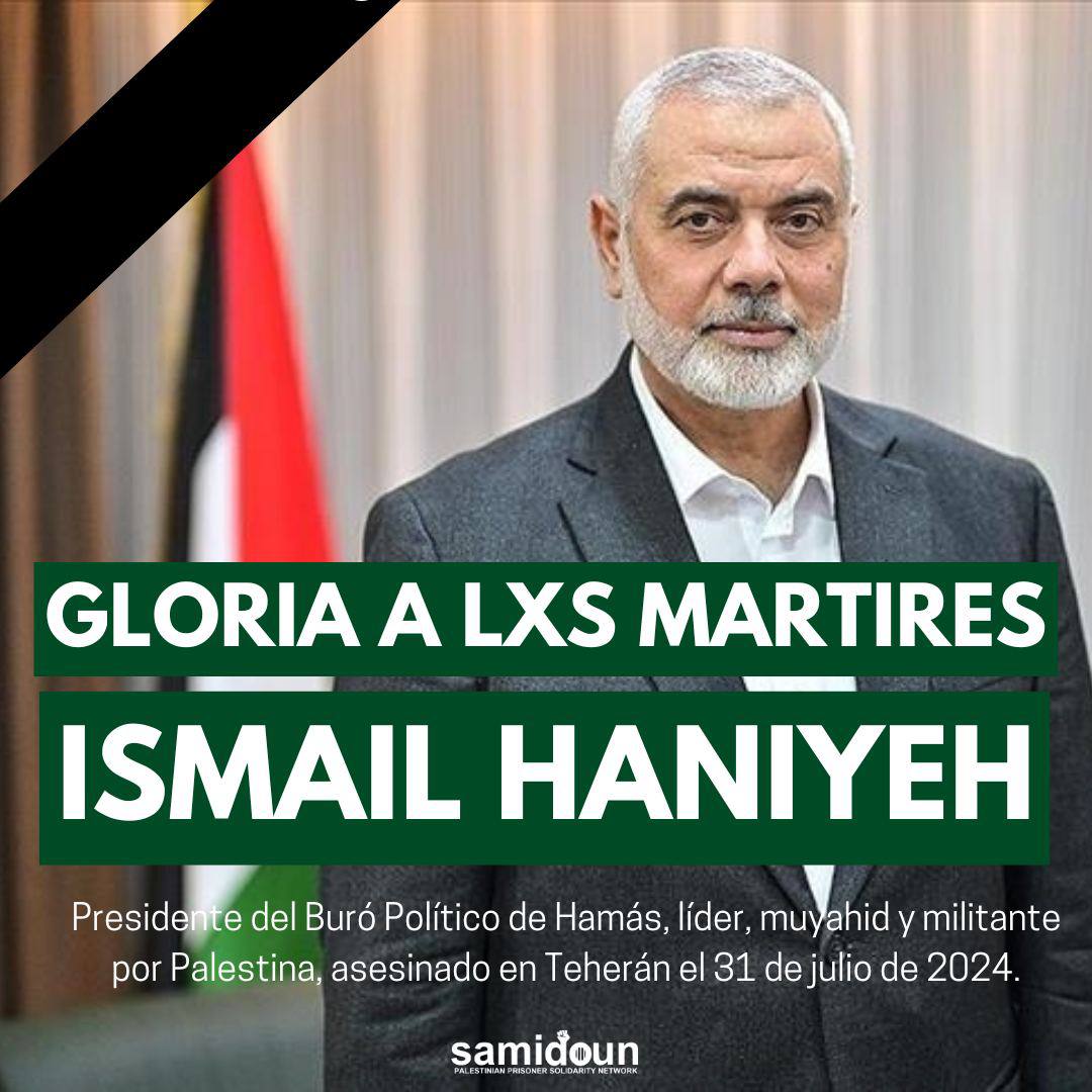 Gloria al mártir Ismail Haniyeh y a todas y todos los mártires de Palestina y de la Resistencia. Retorno, liberación y victoria a Palestina, a toda Palestina, del río al mar.