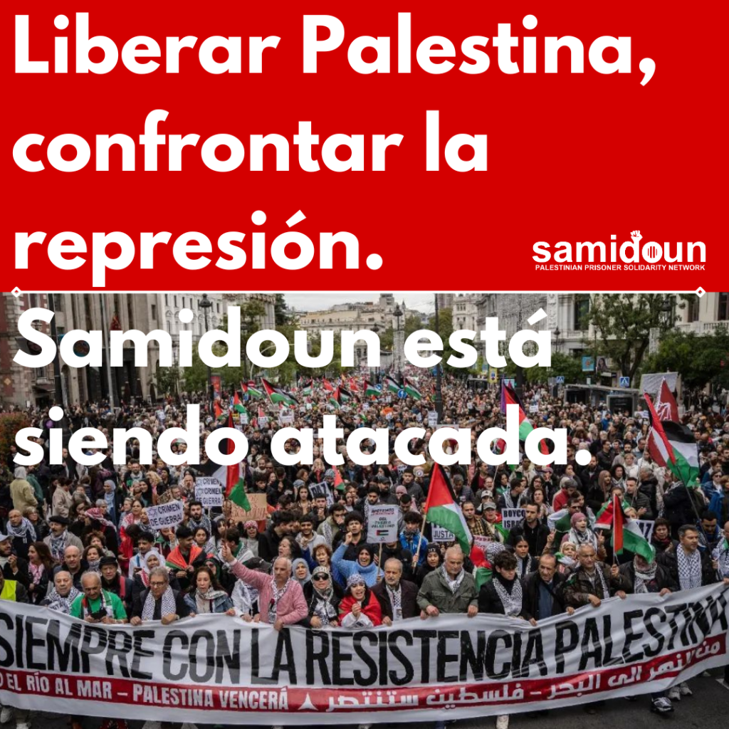 Este contexto represivo ya ha llegado al Estado español donde las instituciones del Estado junto con los movimientos reaccionarios han dado un paso más y están encausando a militantes de Samidoun. De la mano de fuerzas políticas reaccionarias y el lobby israelí, se nos pretende encausar por el mero hecho de explicar a la sociedad por qué la resistencia anticolonial es legítima incluso bajo el derecho internacional actual y por defender los derechos de todos los prisioneros y prisioneras políticas palestinas. A esta apertura de investigaciones se le unen otras estrategias represivas que ya hemos visto en otros espacios internacionales como: