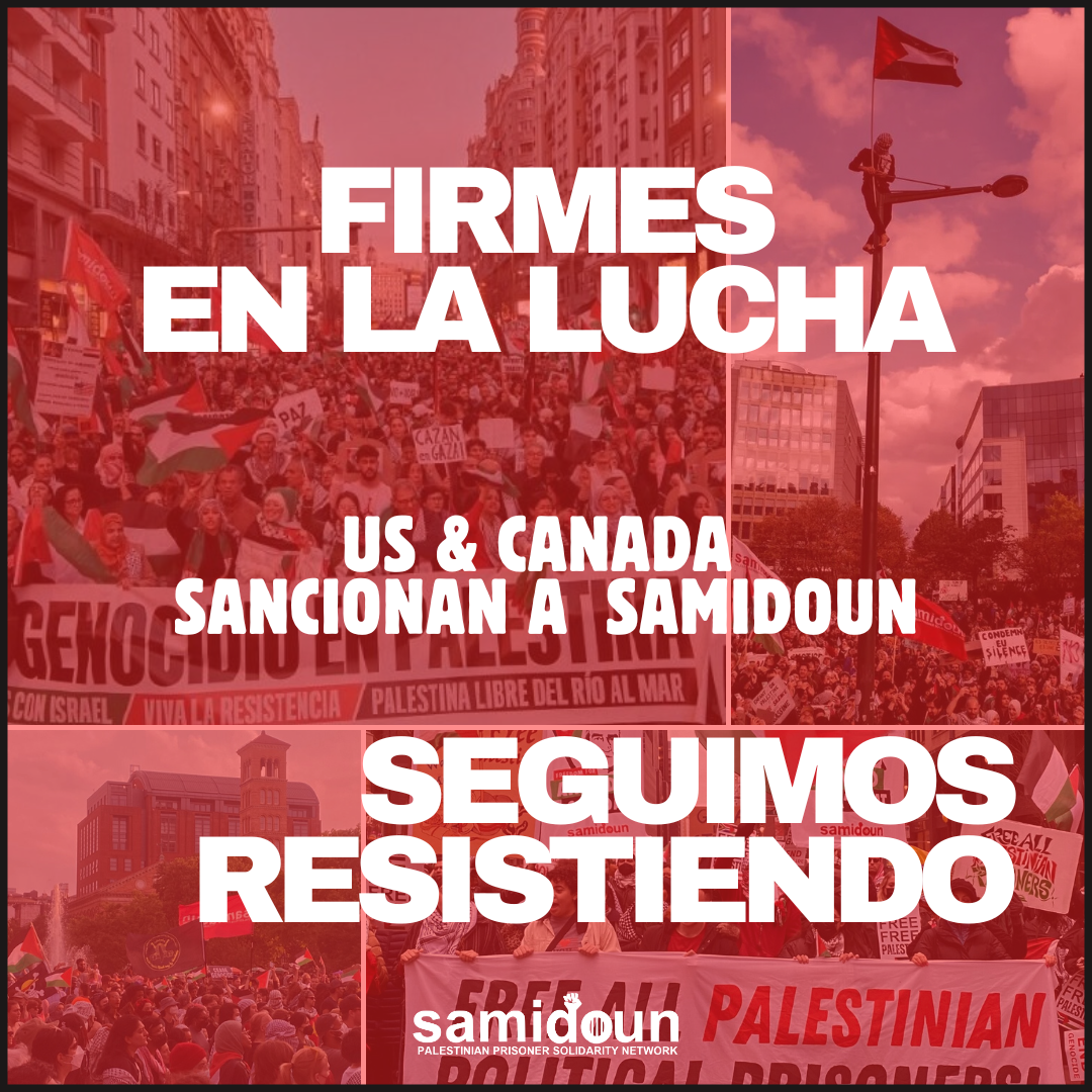 El 15 de octubre, Estados Unidos y Canadá sancionaron a Samidoun en un intento de reprimir la organización política en apoyo a la lucha del pueblo palestino contra el genocidio, el colonialismo, la ocupación, y a los más de 10.000 presos políticos palestinos que están siendo torturados y asesinados por la entidad sionista.