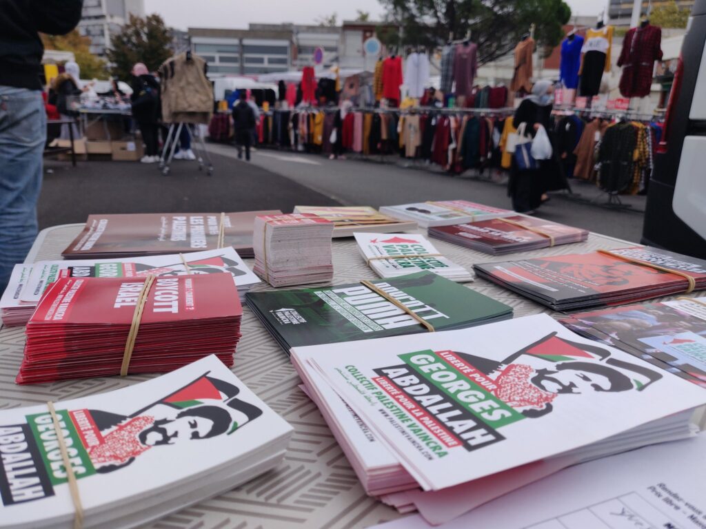 Notre table d’information a également connu un vif intérêt malgré une météo qui n’était pas vraiment au rendez-vous… De nombreux mini-guides « Boycott Israël » ainsi que des dépliants à propos de la libération de tou·te·s les prisonniers palestiniens ont été distribués aux personnes soucieuses de s’investir en soutien au peuple palestinien. Par ailleurs, nous avons déployé deux banderoles expliquant la colonisation de la Palestine et l’histoire de Georges Abdallah qui ont attiré l’attention de nombreuses personnes.