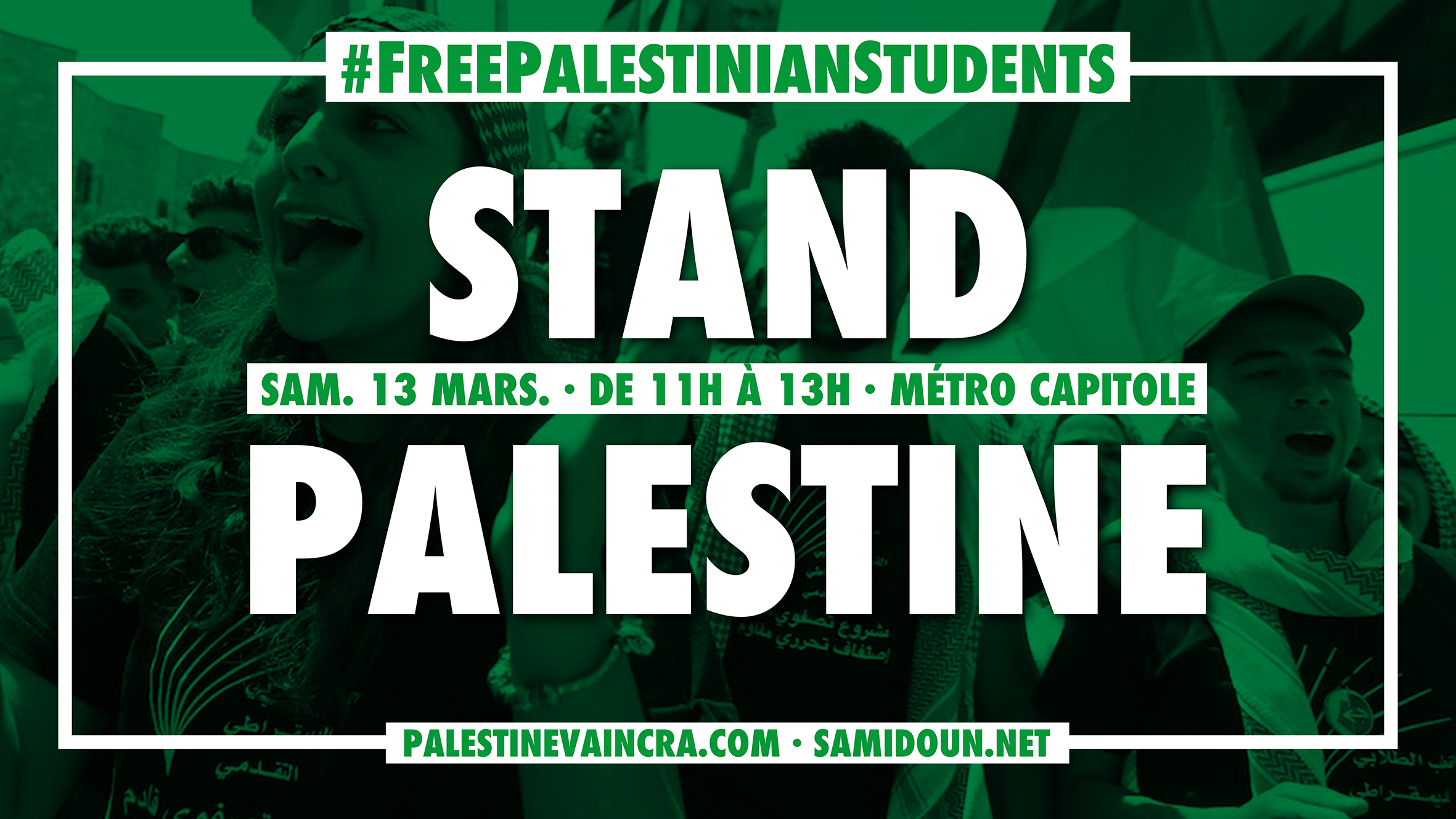 Ce mois-ci, ce Stand Palestine est consacré à la campagne #FreePalestinianStudents. Par ailleurs, nous réaffirmerons à cette occasion notre soutien à Olivia Zémor qui passe en procès le 16 mars prochain à Lyon pour avoir soutenu l’appel au #BoycottTEVA.