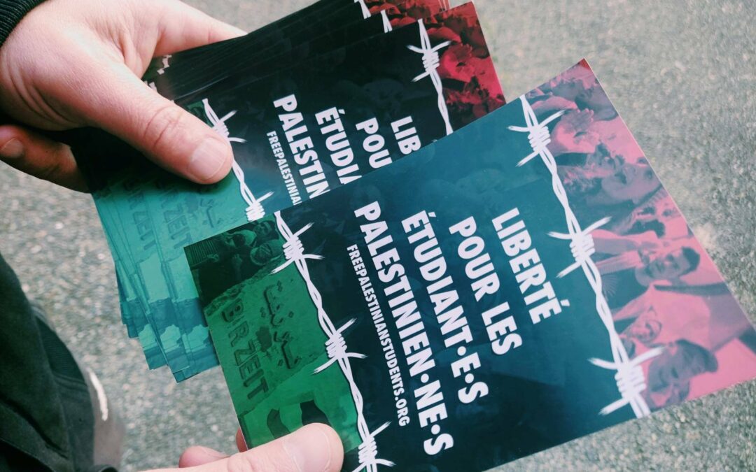Ce Stand Palestine est l’occasion de venir nous rencontrer, participer à la distribution de flyers, découvrir notre exposition sur les étudiant·e·s palestinien·ne·s emprisonné·e·s. Mais aussi de venir faire une photo de soutien, écrire une carte à un·e étudiant·e palestinien·ne, récupérer des stickers et dépliants gratuits, acheter un calendrier ou un t-shirt, etc.