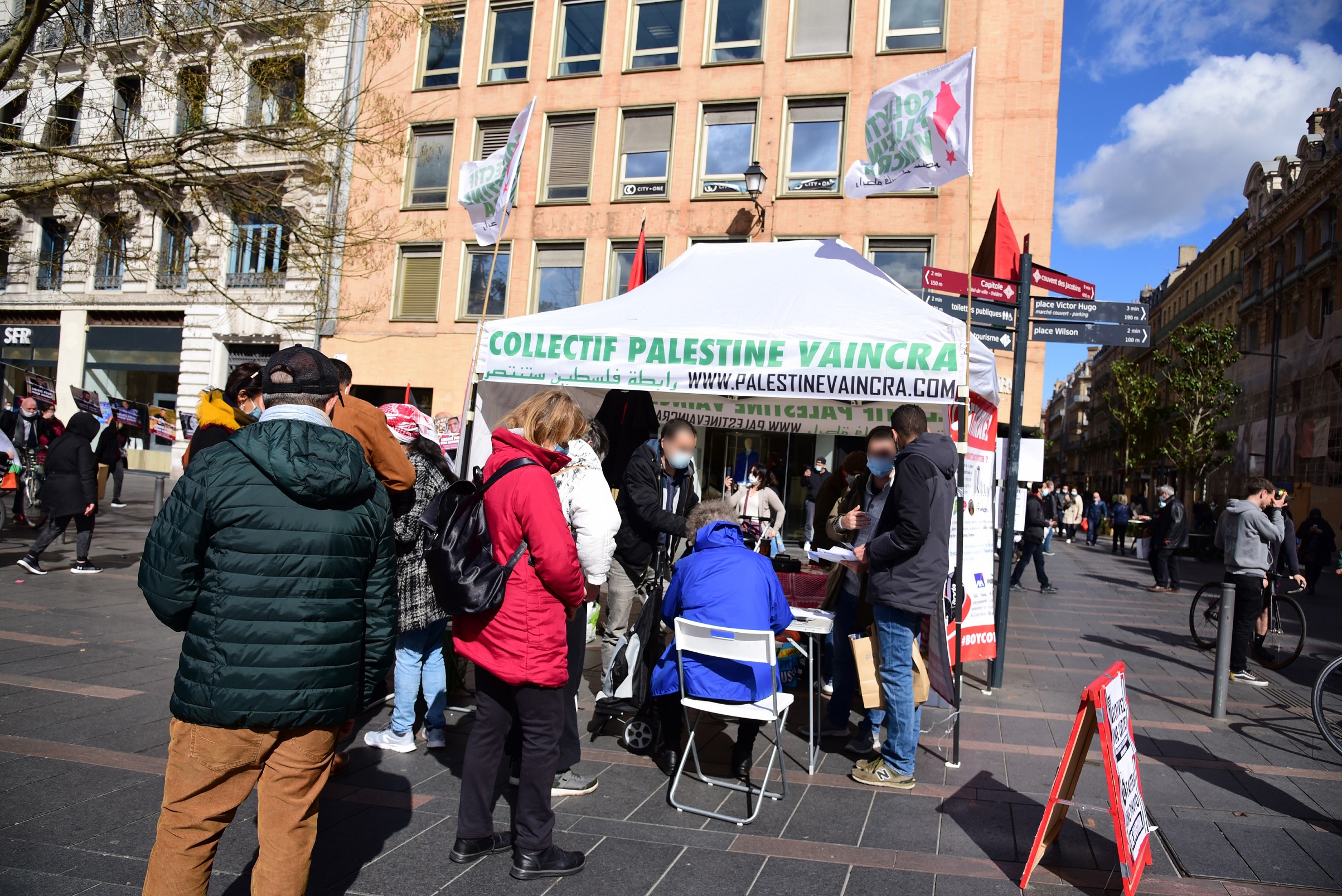 Samedi 13 mars à la sortie du métro Capitole à Toulouse, une vingtaine de militant·e·s et sympathisant·e·s du Collectif Palestine Vaincra ont organisé pendant plus de 2H un Stand Palestine. Celui-ci avait lieu dans le cadre de la campagne internationale pour la libération des étudiant·e·s palestinien·ne·s emprisonné·e·s qui regroupe plus de 350 organisations à travers le monde.