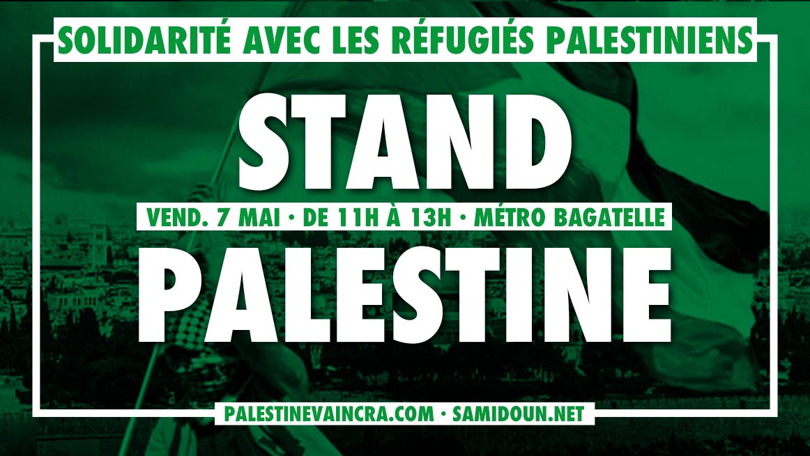 Vendredi 7 mai, nous tenons un Stand Palestine à la sortie du métro Bagatelle de 11H à 13H de solidarité avec le peuple palestinien et sa résistance. À cette occasion, nous organisons une collecte de solidarité au Club Culturel Arabe Palestinien du camp de réfugiés palestiniens de Nahr el-Bared dans le Nord du Liban. Celui-ci organise une campagne de soutien pour équiper une nouvelle ambulance utilisée dans la lutte contre l’épidémie actuelle. Ils estiment les besoins nécessaires à 5000 $ répartis sur la civière, la décoration intérieure, l’habillage du toit et du sol, les armoires à pharmacie, les bouteilles d’oxygène, les désinfectants, etc. N’hésitez pas à venir participer à cette initiative à nos côtés, récupérer des stickers et flyers gratuits ou donner quelques euros à la collecte. Ce rassemblement est déposé en préfecture et respecte les mesures sanitaires requises (masques, gel, etc.).