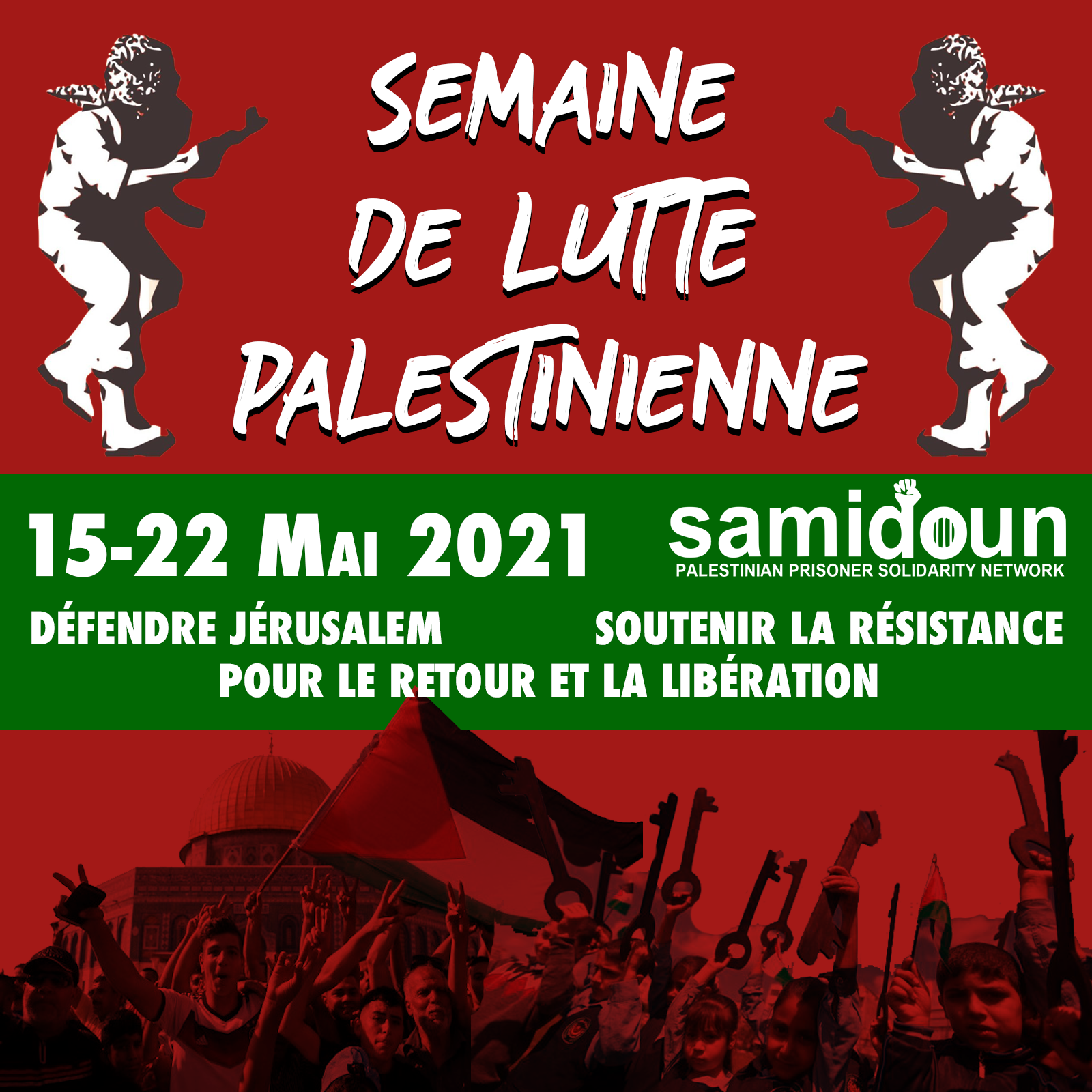 Le réseau de soutien aux prisonniers palestiniens Samidoun, dont est membre le Collectif Palestine Vaincra, appelle les organisations, les militants, les mouvements sociaux et les amis de la Palestine partout dans le monde à agir pour défendre Jérusalem, à se mobiliser pour le droit au retour des Palestiniens, et à agir pour la justice et la libération de toute la Palestine. Nous nous joignons à l’appel de la Semaine de lutte palestinienne, du 15 au 22 mai 2021 : agissez, marchez, rassemblez, protestez, organisez et luttez pour la Palestine ! Lisez l’appel de Masar Badil (Voie palestinienne alternative) ici.