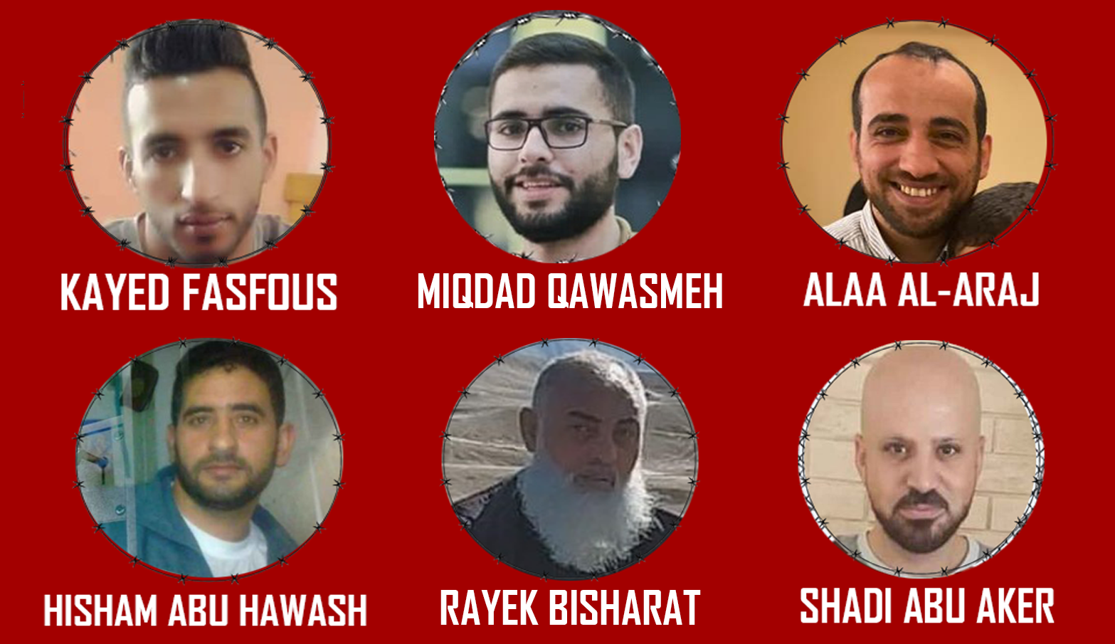 - 4. Hisham Ismail Abu Hawash : âgé de 39 ans et originaire de Dura – al-Khalil (Hébron), il est en grève de la faim depuis 52 jours. Il est emprisonné sans inculpation ni jugement depuis octobre 2020 en détention administrative. Après de multiples arrestations, il a passé huit ans dans les prisons israéliennes. Il est marié et père de quatre enfants.