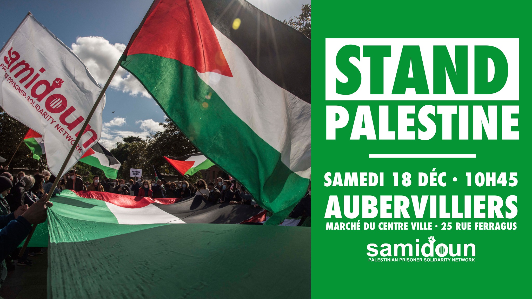 Samedi 18 décembre de 10H45 à 12H30, Samidoun Région Parisienne vous invite à participer à un stand Palestine au marché du centre-ville d’Aubervilliers (25 rue Ferragus). Alors que l’occupation israélienne multiplie les arrestations et les exécutions, en particulier contre la jeunesse palestinienne, nous devons réaffirmer notre soutien au peuple palestinien et à sa résistance légitime. N’hésitez pas à venir nous rencontrer, échanger sur la situation ou distribuer des flyers à nos côtés. See less
